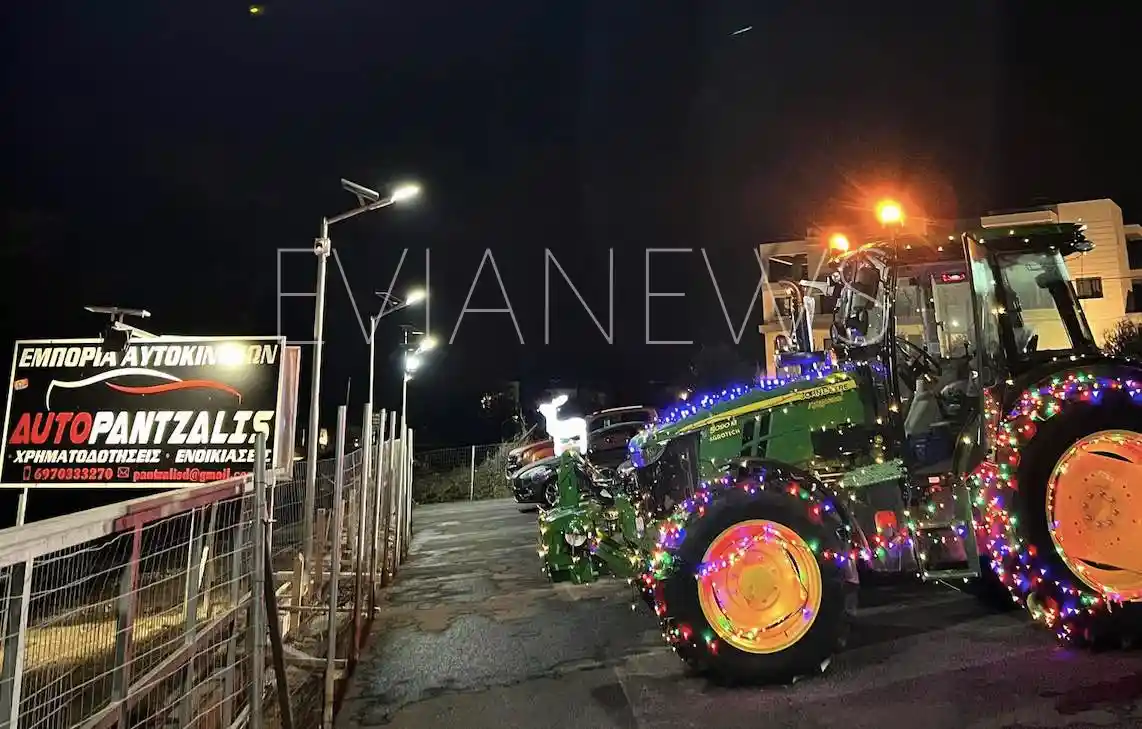 Τα Χριστούγεννα ήρθαν στο Αλιβέρι της Εύβοιας και δύο φίλοι αποφάσισαν αντί για δέντρο να στολίσουν… τρακτέρ, στη μάντρα που διατηρεί ο ένας από τους δύο άνδρες.