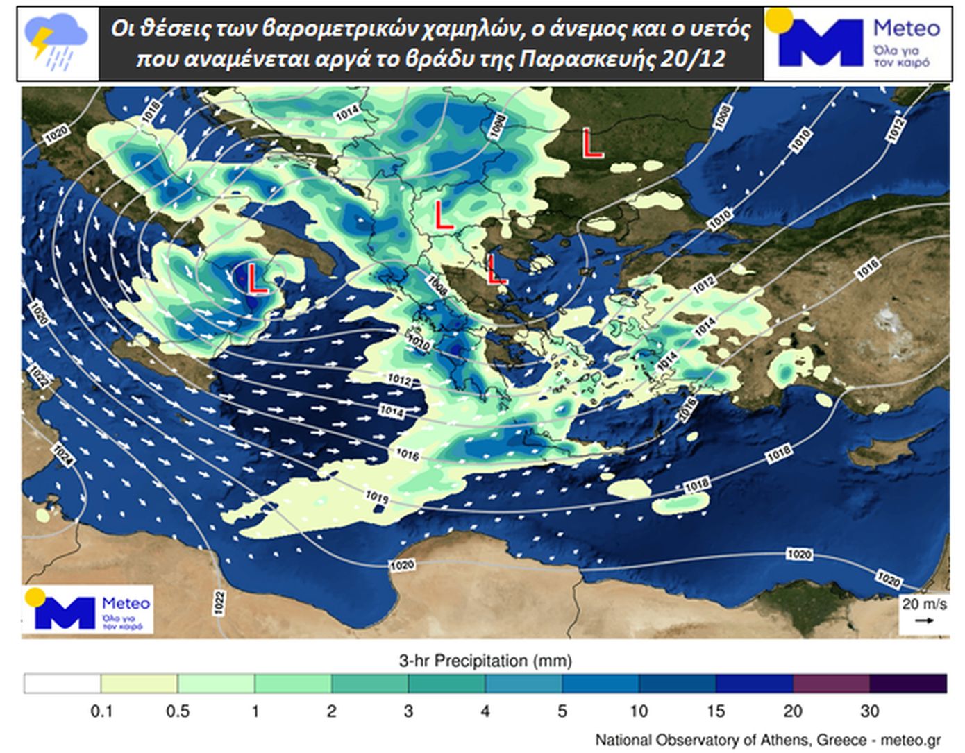Σύμφωνα και με τα τελευταία προγνωστικά δεδομένα του meteo.gr / Εθνικού Αστεροσκοπείου Αθηνών, ο καιρός θα παρουσιάσει μεταβολή από το μεσημέρι της Παρασκευής 20/12. Βαρομετρικό χαμηλό, κινούμενο ανατολικά θα επηρεάσει τον καιρό της χώρας έως και το Σάββατο 21/12., τα κυριότερα χαρακτηριστικά του καιρού έως το Σάββατο 21/12 θα είναι:
