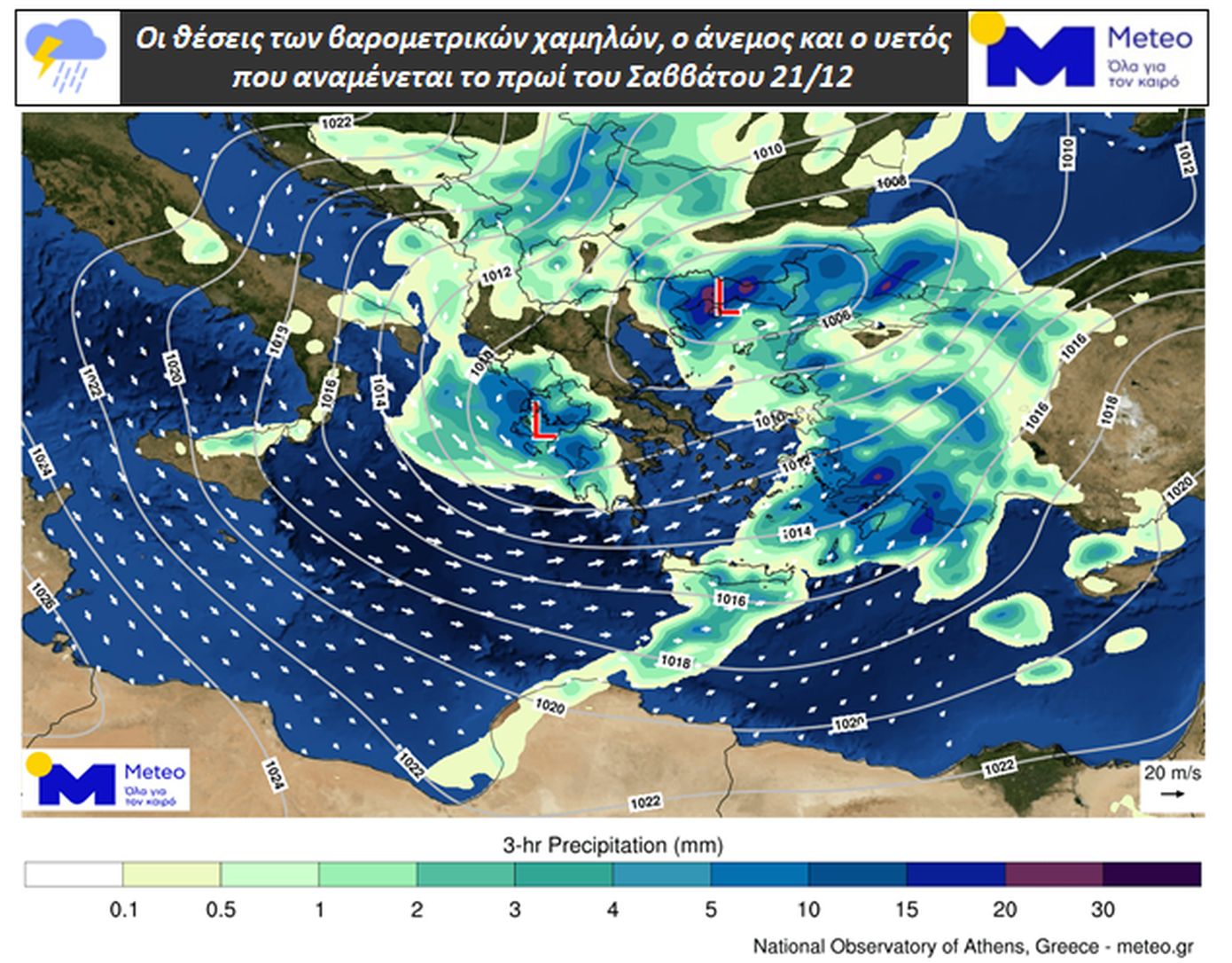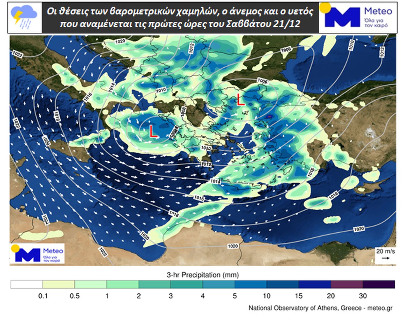 Στους χάρτες που ακολουθούν παρουσιάζεται ο υετός, ο άνεμος και οι θέσεις των βαρομετρικών χαμηλών όπως αυτά αναμένονται αργά το βράδυ της Παρασκευής 20/12, τις πρώτες ώρες του Σαββάτου 21/12 καθώς και το πρωί του Σαββάτου 21/12.