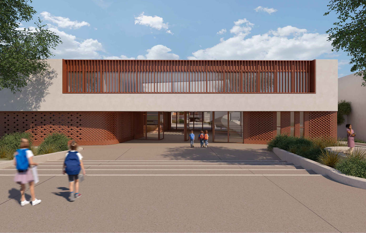 Η αρχιτεκτονική μελέτη του έργου εκπονείται από το Γραφείο Τομπάζη, με βασικές της διαστάσεις τον σεβασμό προς το περιβάλλον και την ενίσχυση της ευεξίας των μαθητών