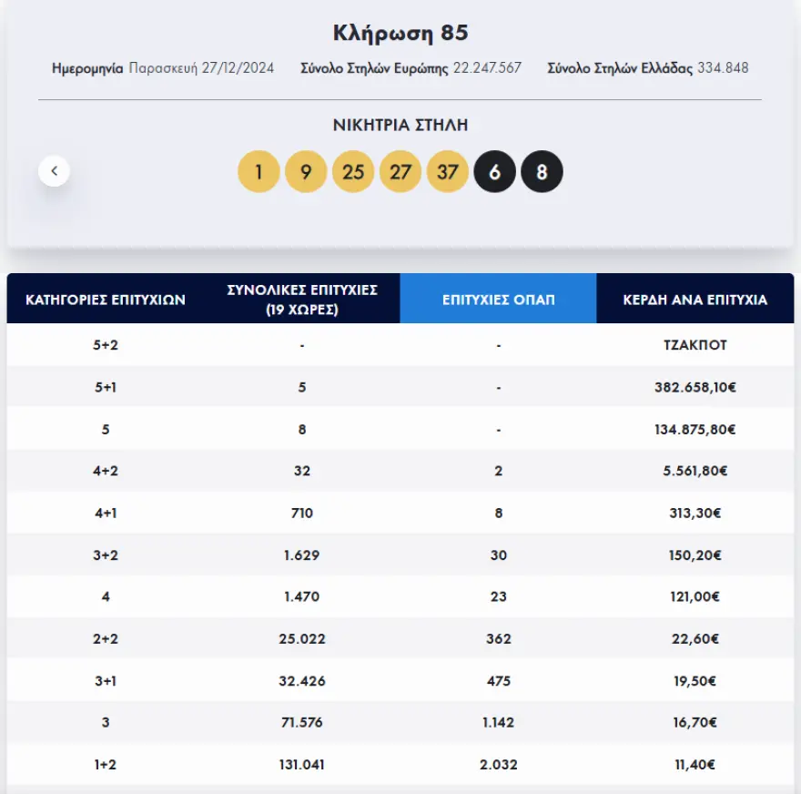 Οι τυχεροί αριθμοί είναι οι εξής: 1, 9, 25, 27, 37 και eurojackpot οι αριθμοί 6, 8.