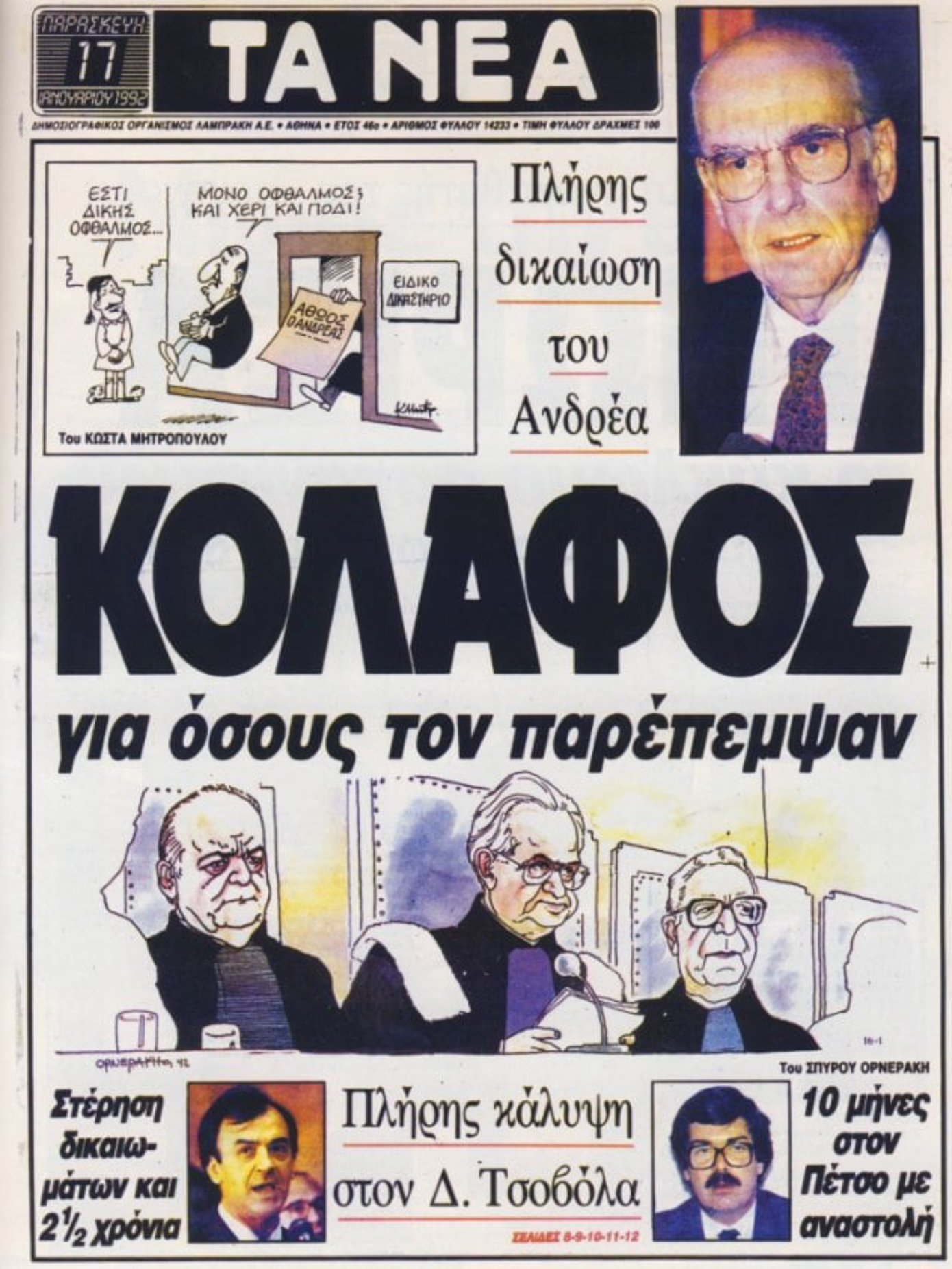 Στις 16 Ιανουαρίου 1992, το Ειδικό Δικαστήριο εξέδωσε την ιστορική του ετυμηγορία για την υπόθεση του σκανδάλου Κοσκωτά, που είχε συγκλονίσει την ελληνική πολιτική σκηνή για πάνω από τρία χρόνια. Ο πρώην πρωθυπουργός Ανδρέας Παπανδρέου αθωώθηκε με οριακή πλειοψηφία (7-6), ενώ ο Δημήτρης Τσοβόλας, πρώην υπουργός Οικονομικών, καταδικάστηκε σε ποινή φυλάκισης δυόμισι ετών και στέρηση πολιτικών δικαιωμάτων. Στην ίδια δίκη, ο Γιώργος Πέτσος, πρώην υπουργός Βιομηχανίας, καταδικάστηκε σε φυλάκιση 12 μηνών. Η απόφαση αυτή αποτέλεσε το τέλος μίας από τις πιο πολωτικές περιόδους της σύγχρονης ελληνικής πολιτικής ιστορίας.