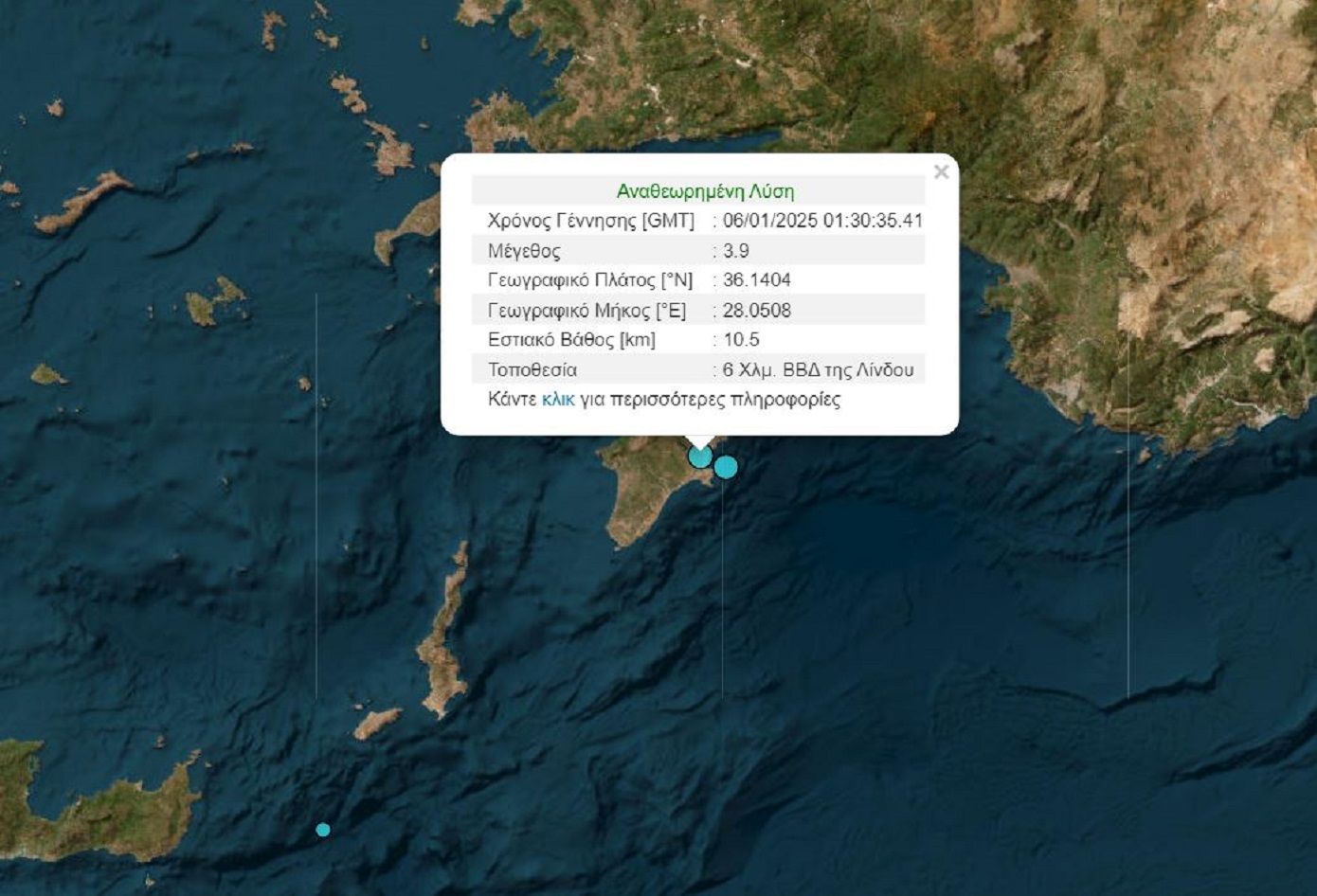 Σεισμός μεγέθους 3,9 βαθμών της κλίμακας Ρίχτερ σημειώθηκε στις 03:30 τα ξημερώματα στη Ρόδο.