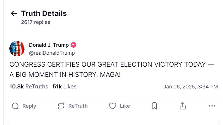 «Το Κογκρέσο πιστοποιεί σήμερα τη μεγάλη εκλογική μας νίκη – μια μεγάλη στιγμή στην ιστορία. MAGA!» έγραψε νωρίτερα ο Τραμπ στην πλατφόρμα κοινωνικής δικτύωσης Truth Social.