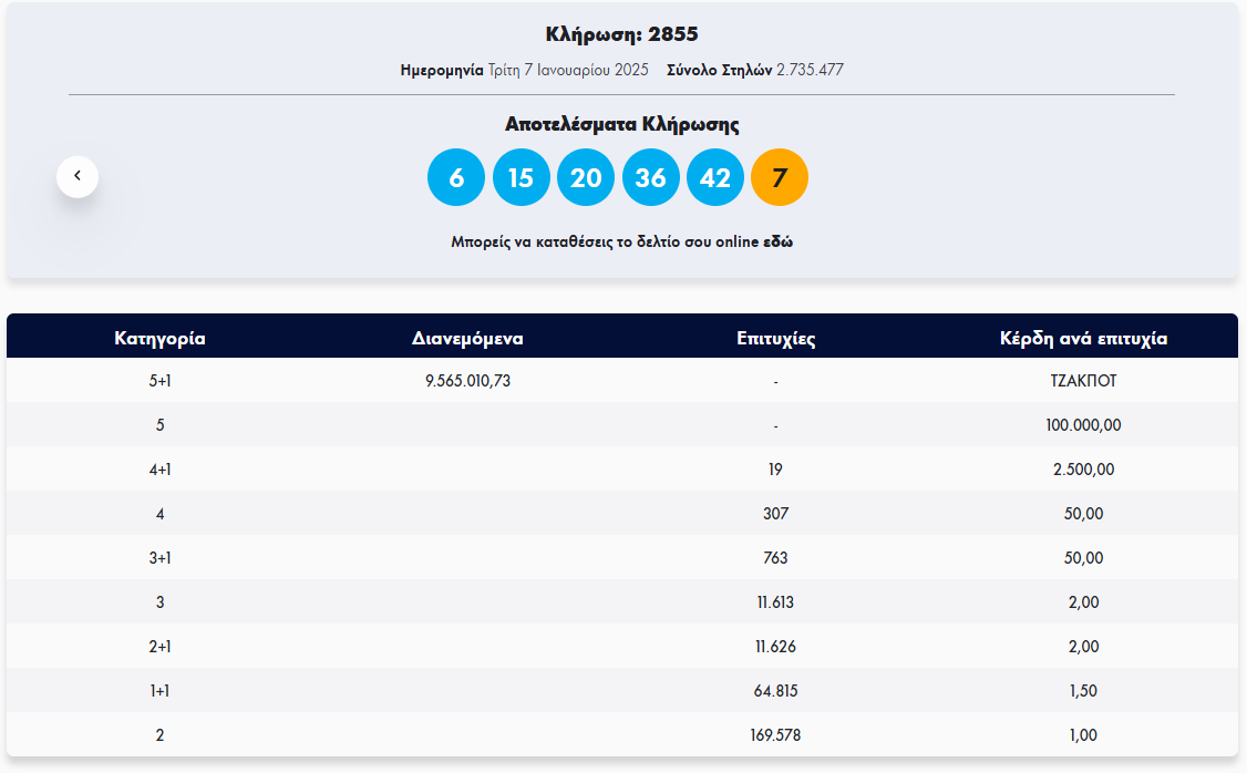 Σήμερα, Τρίτη 7 Ιανουαρίου 2025, στην κλήρωση 2855 του Τζόκερ του ΟΠΑΠ θα μοιραστούν στους τυχερούς της πρώτης κατηγορίας τουλάχιστον 9.500.000 ευρώ.