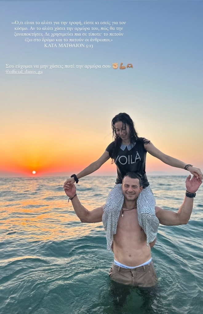 Η σύζυγος του Γιώργου Αγγελόπουλου δημοσίευσε ένα κοινό στιγμιότυπο τους από τη θάλασσα, το οποίο συνόδευσε με ένα κομμάτι από το Κατά Ματθαίον Ευαγγέλιον κι ευχήθηκε στον σύζυγό της: «Σου εύχομαι να μη χάσεις ποτέ την αρμύρα σου».