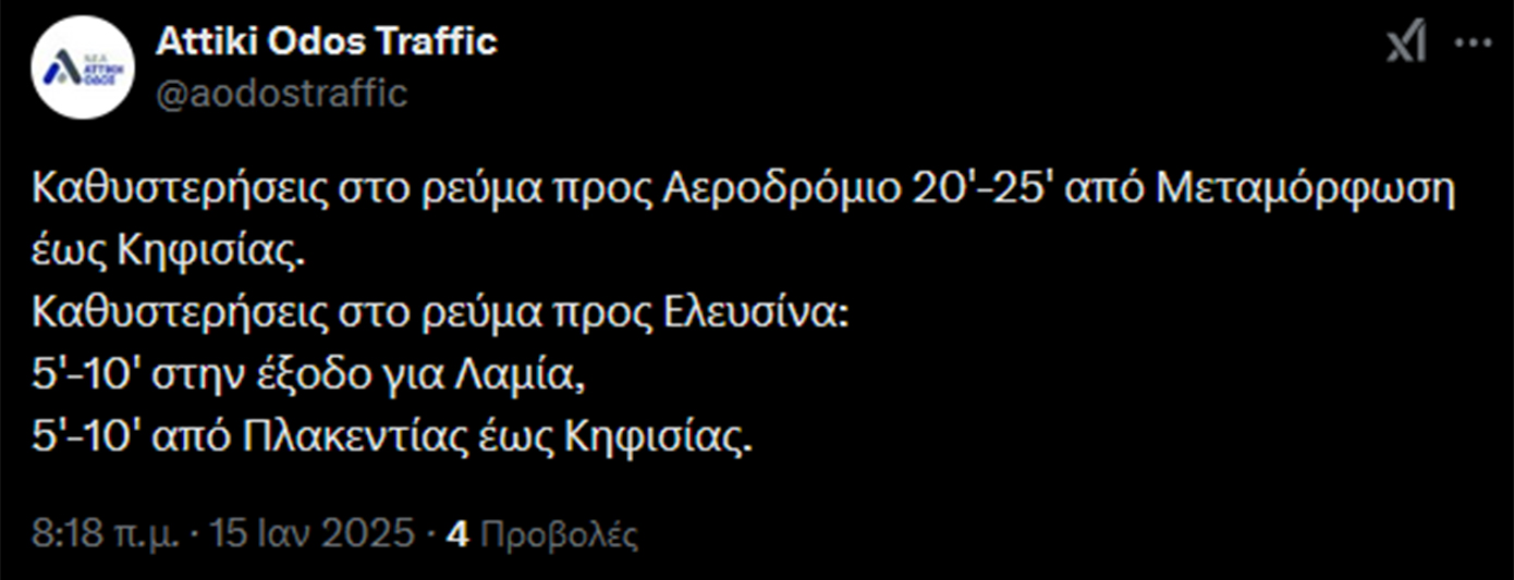 Στην Αττική Οδό παρατηρούνται καθυστερήσεις στο ρεύμα προς Αεροδρόμιο 20′-25′ από Μεταμόρφωση έως Κηφισίας και 5′-10′ στην έξοδο για Λαμία στο ρεύμα προς Ελευσίνα.