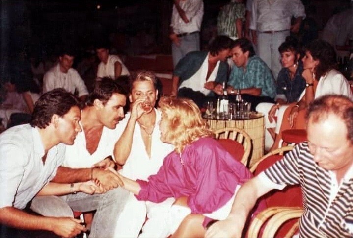 Στη φωτογραφία φαίνεται η κουμπάρα μου και νονά της πρώτης μου συζύγου, η κορυφαία των κορυφαίων, η Μαρινέλλα, ο Δημήτρης Σουλελές, ο επιχειρηματίας και ιδιοκτήτης του “Ειρηνικού”, του κορυφαίου κέντρου διασκεδάσεως της εποχής, και αριστερά εγώ.