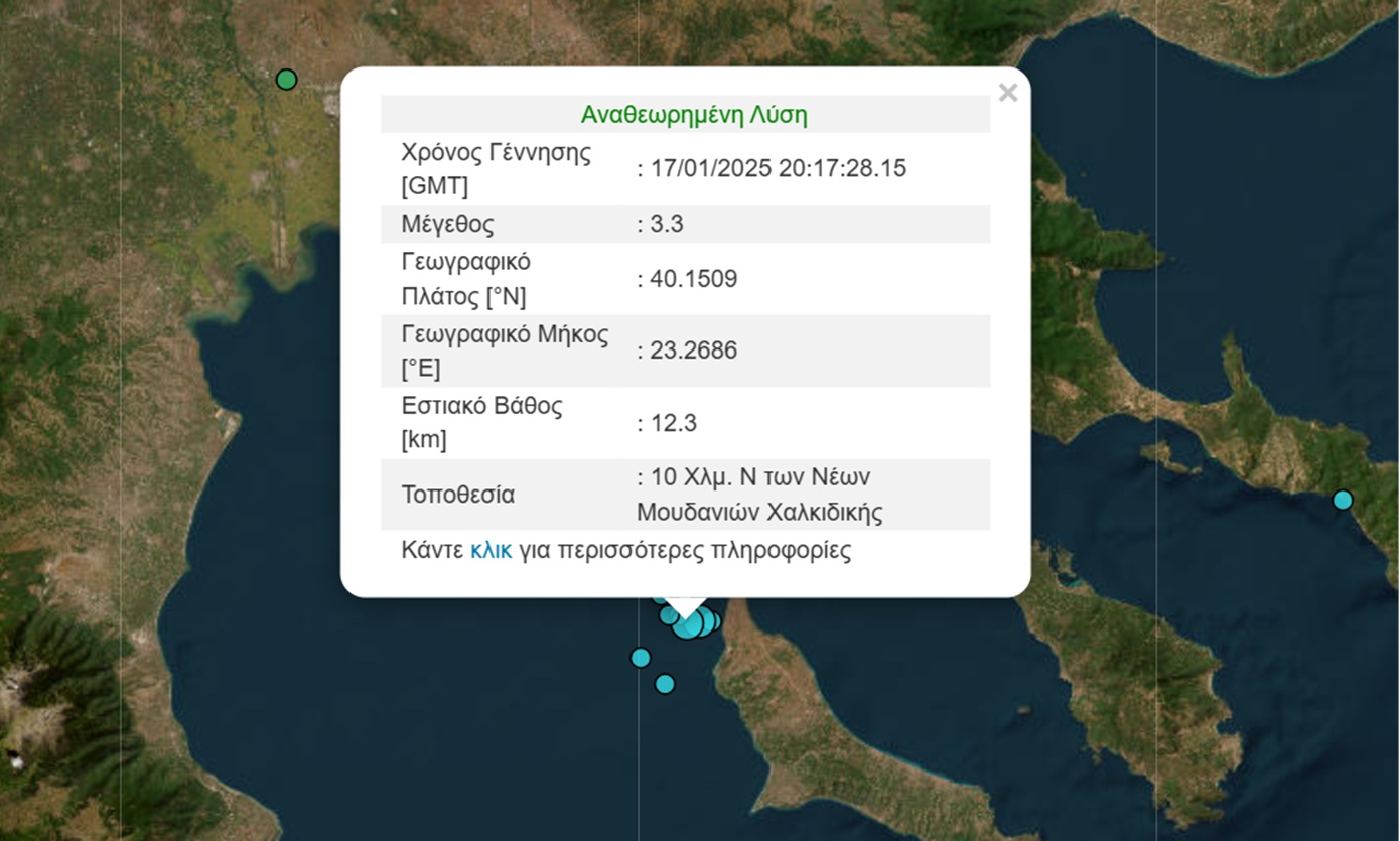Στις 22:37, ακολούθησε ακόμη μία δόνηση, μεγέθους 2,9 βαθμών Ρίχτερ, 7 χιλιόμετρα νότια των Νέων Μουδανίων, με εστιακό βάθος 5 χιλιόμετρα.