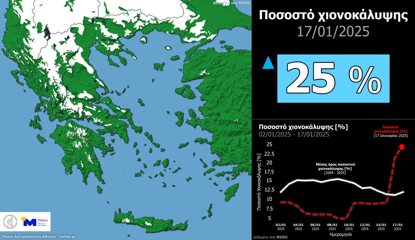 Τα νεότερα δορυφορικά δεδομένα για τη χιονοκάλυψη στη χώρα μας στις 17/01 δείχνουν ότι περίπου το 25% της χερσαίας έκτασης της Ελλάδας καλύπτονται με χιόνι, κάτι που σημαίνει ότι το ποσοστό χιονοκάλυψης είναι πάνω από το μέσο όρο της περιόδου 2004-2024 για το δεύτερο δεκαήμερο του Ιανουαρίου. Το ποσοστό αυτό αναμένεται να πέσει κάτω από το μέσο όρο τις επόμενες εβδομάδες, καθώς αναμένεται άνοδος της θερμοκρασίας και απουσία φρέσκου χιονιού.