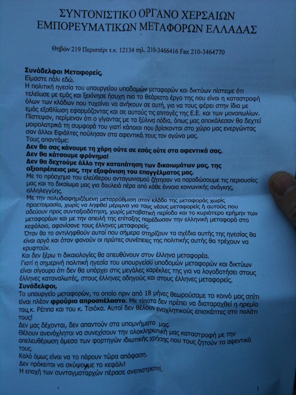 Οι ιδιοκτήτες έχουν παρατάξει τα φορτηγά τους στην πλαϊνή είσοδο του υπουργείου, επί της οδού Αναστάσεως.