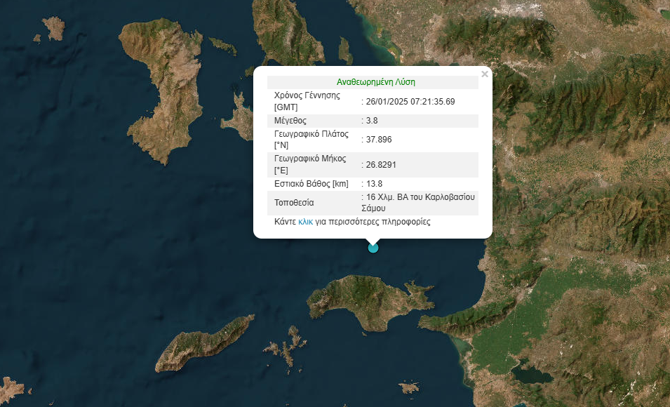 Ισχυρή σεισμική δόνηση μεγέθους 3,8 Ρίχτερ σημειώθηκε το πρωί της Κυριακής 26 Ιανουαρίου στη Σάμο.