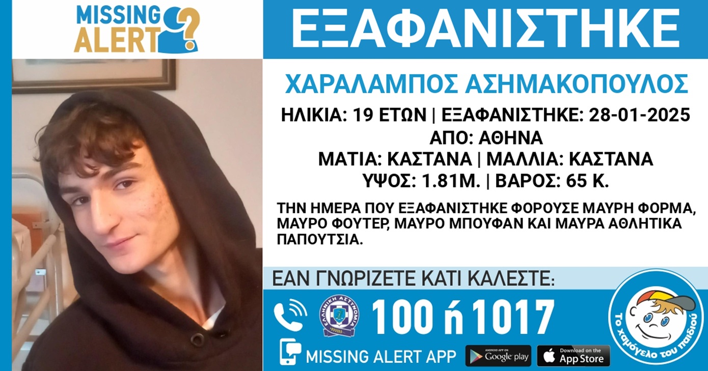 Πρόκειται για τον 19χρονο Χαράλαμπο Ασημακόπουλο. «Το Χαμόγελο του Παιδιού» ενημερώθηκε για την εξαφάνιση του και προχώρησε άμεσα στη δημοσιοποίηση των στοιχείων του, κατόπιν αιτήματος της οικογένειάς του, καθώς υπάρχουν σοβαροί λόγοι που ενδέχεται να θέτουν σε κίνδυνο τη ζωή του.