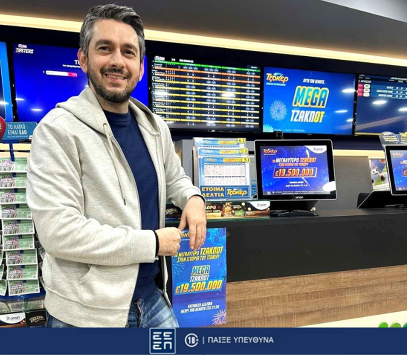 «Το ΤΖΟΚΕΡ μονοπωλεί το ενδιαφέρον των πελατών μας το τελευταίο διάστημα και η σημερινή ημέρα δεν θα αποτελέσει εξαίρεση. Όλοι όσοι επισκέπτονται το πρακτορείο μας συμμετέχουν στην αποψινή κλήρωση για να διεκδικήσουν τα 19,5 εκατ. ευρώ», υπογραμμίζει ο Γιώργος Καρύδας, ιδιοκτήτης καταστήματος ΟΠΑΠ στη Θεσσαλονίκη.
