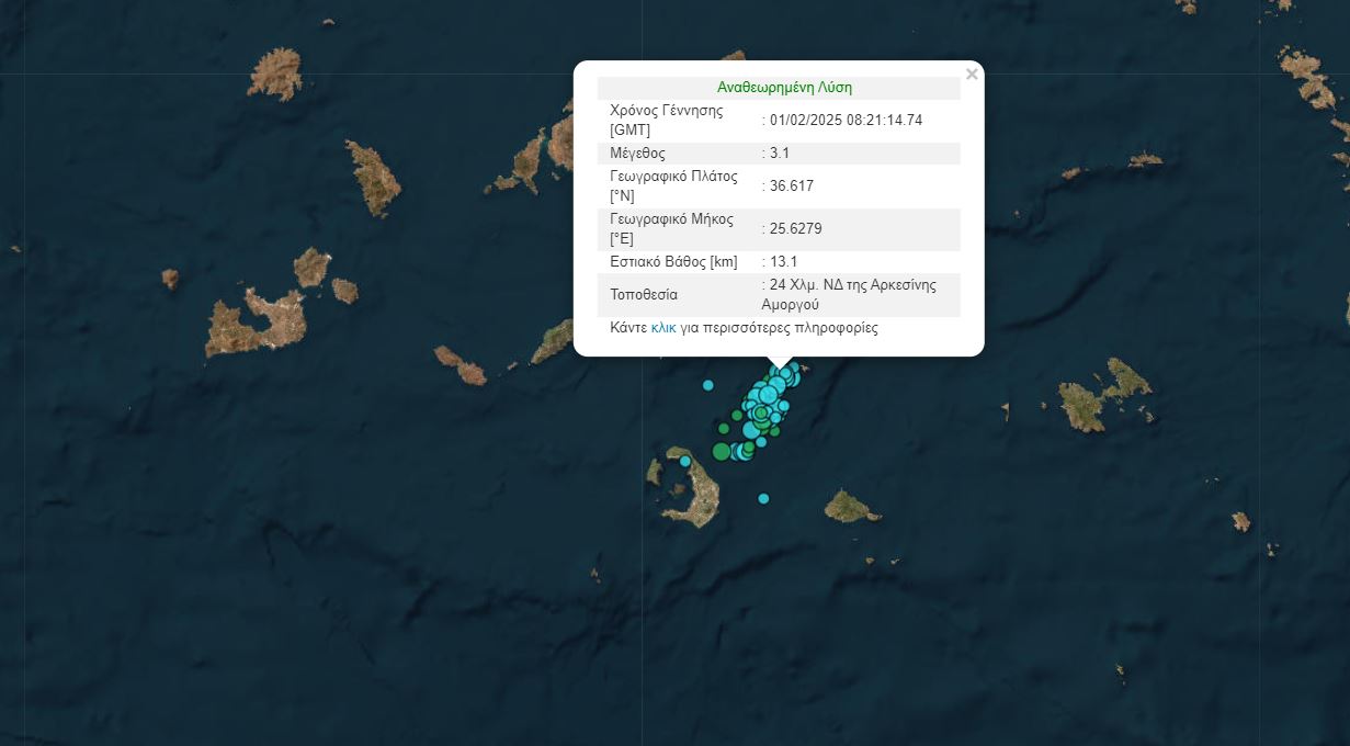 Η πρώτη σημειώθηκε 24 χλμ νοτιοδυτικά της Αρκεσίνης Αμοργού, είχε μέγεθος 3,1 βαθμούς της κλίμακας Ρίχτερ και εστιακό βάθος 13,1 χιλιομέτρων.