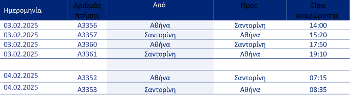Προσθήκη τριών εκτάκτων πτήσεων από και προς τη Σαντορίνη πρόσθεσε η AEGEAN για τις 3 και 4 Φεβρουαρίου, λόγω της έντονης σεισμικής δραστηριότητας που παρατηρείται τα τελευταία εικοσιτετράωρα.