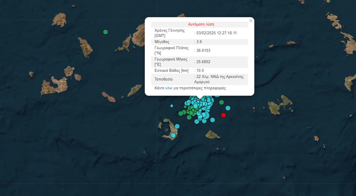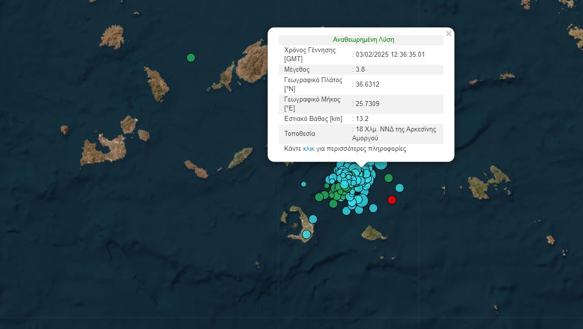 Στις 14:36, νέα δόνηση μεγέθους 3,8 βαθμών της κλίμακας Ρίχτερ, 18 χλμ. νοτιοδυτικά της Αρκεσίνης Αμοργού, με εστιακό βάθος στα 13,2 χλμ.