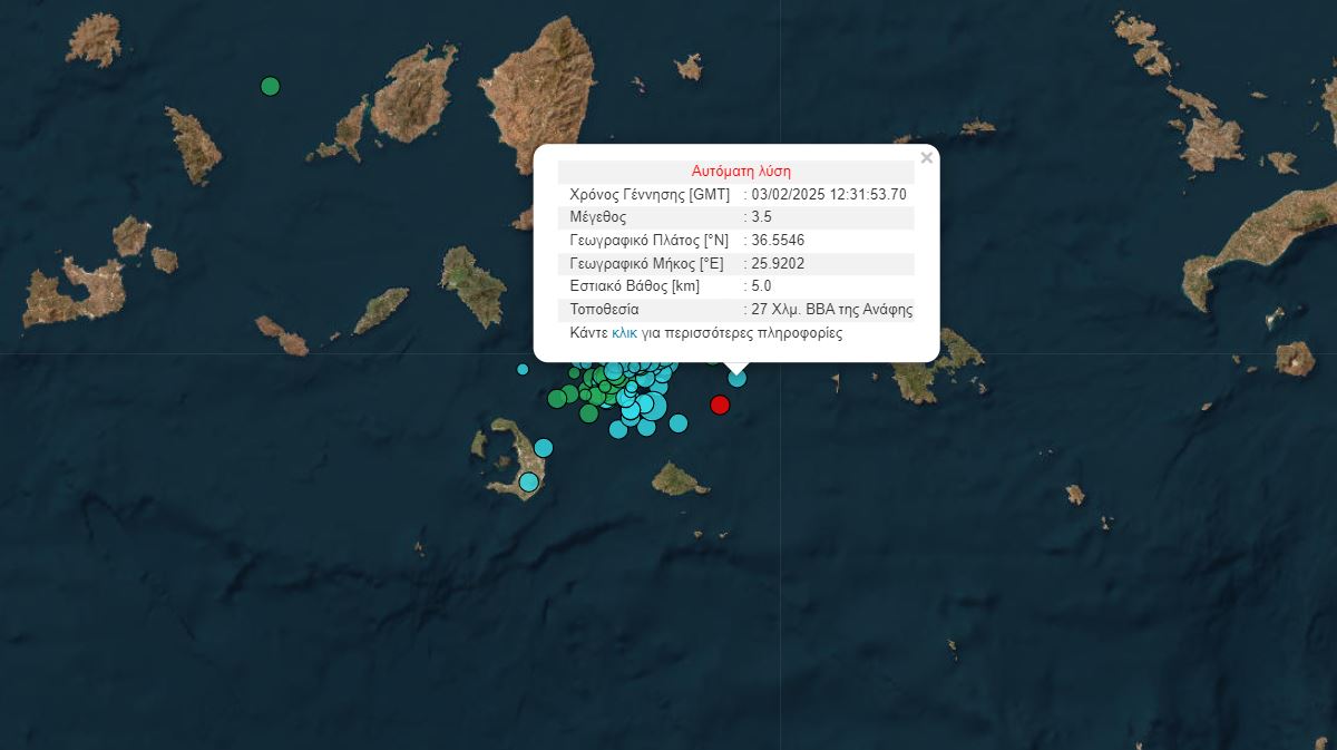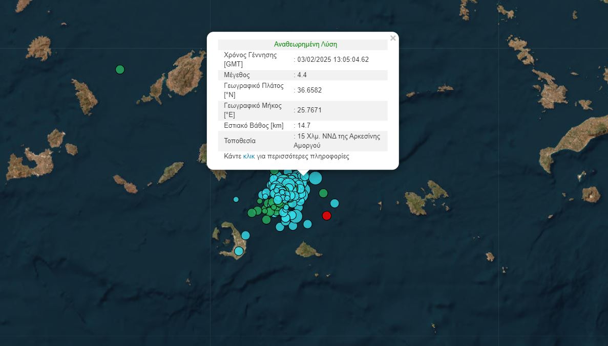 Πέντε σεισμοί, με τον μικρότερο στους 3,5 βαθμούς της κλίμακας Ρίχτερ και τον μεγαλύτερο στους 4,4 σημειώθηκαν στην περιοχή μεταξύ Αμοργού και Σαντορίνης, μεταξύ 14:15 και 15:15, αποδεικνύοντας την έντονη δραστηριότητα στην περιοχή.