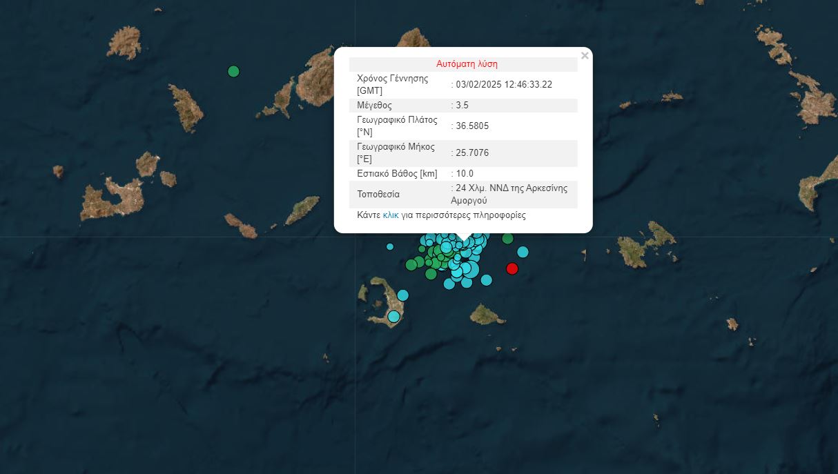 Στις 14:46, σεισμός μεγέθους 3,5 βαθμών της κλίμακας Ρίχτερ, 24 χλμ. νοτιοδυτικά της Αρκεσίνης Αμοργού, σε εστιακό βάθος 10 χλμ.