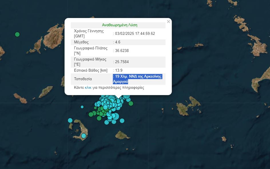 Σεισμική δόνηση μεγέθους 4,6 βαθμών της κλίμακας Ρίχτερ σημειώθηκε στις 19:44 το απόγευμα της Δευτέρας κοντά στην Αμοργό.
