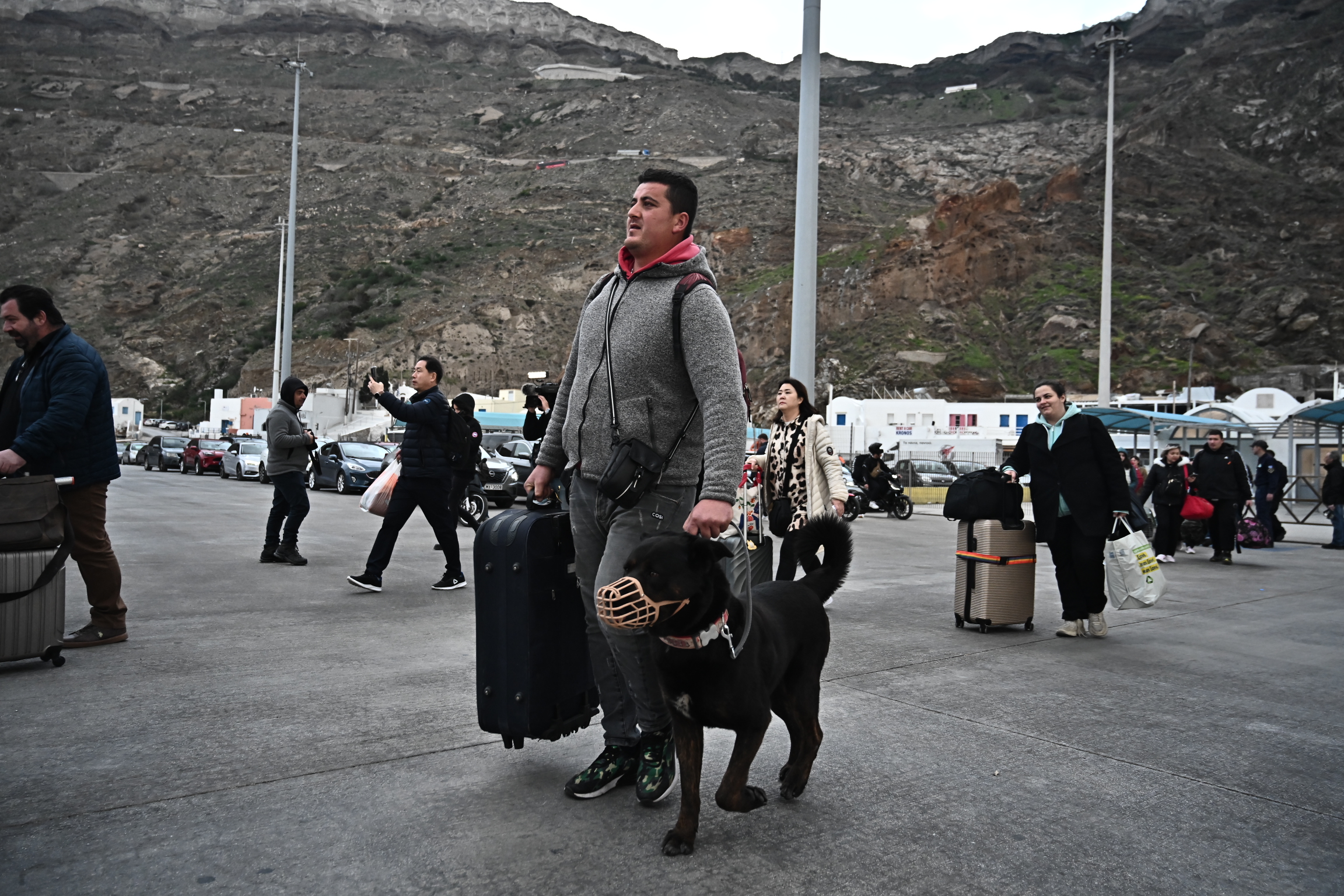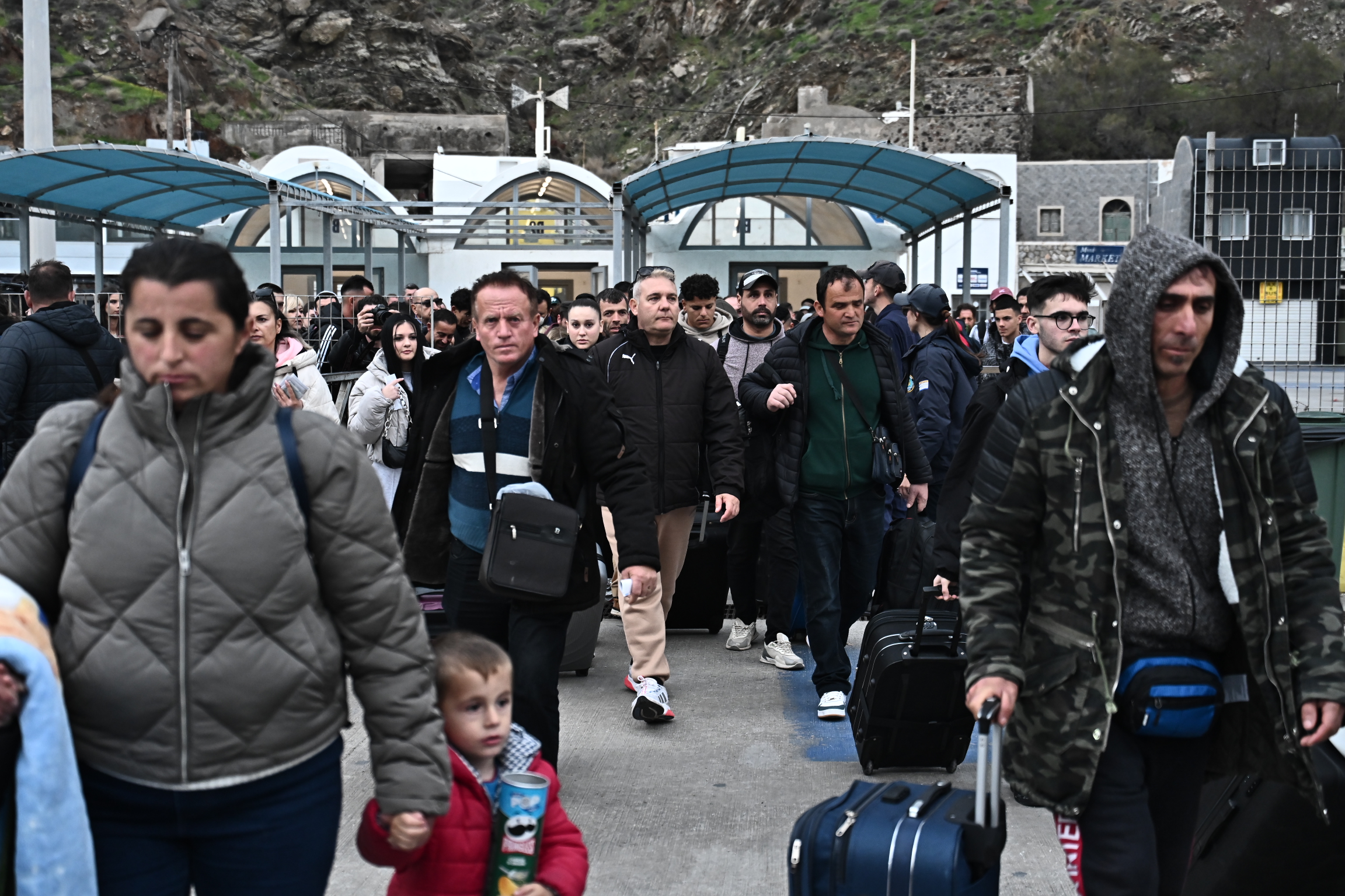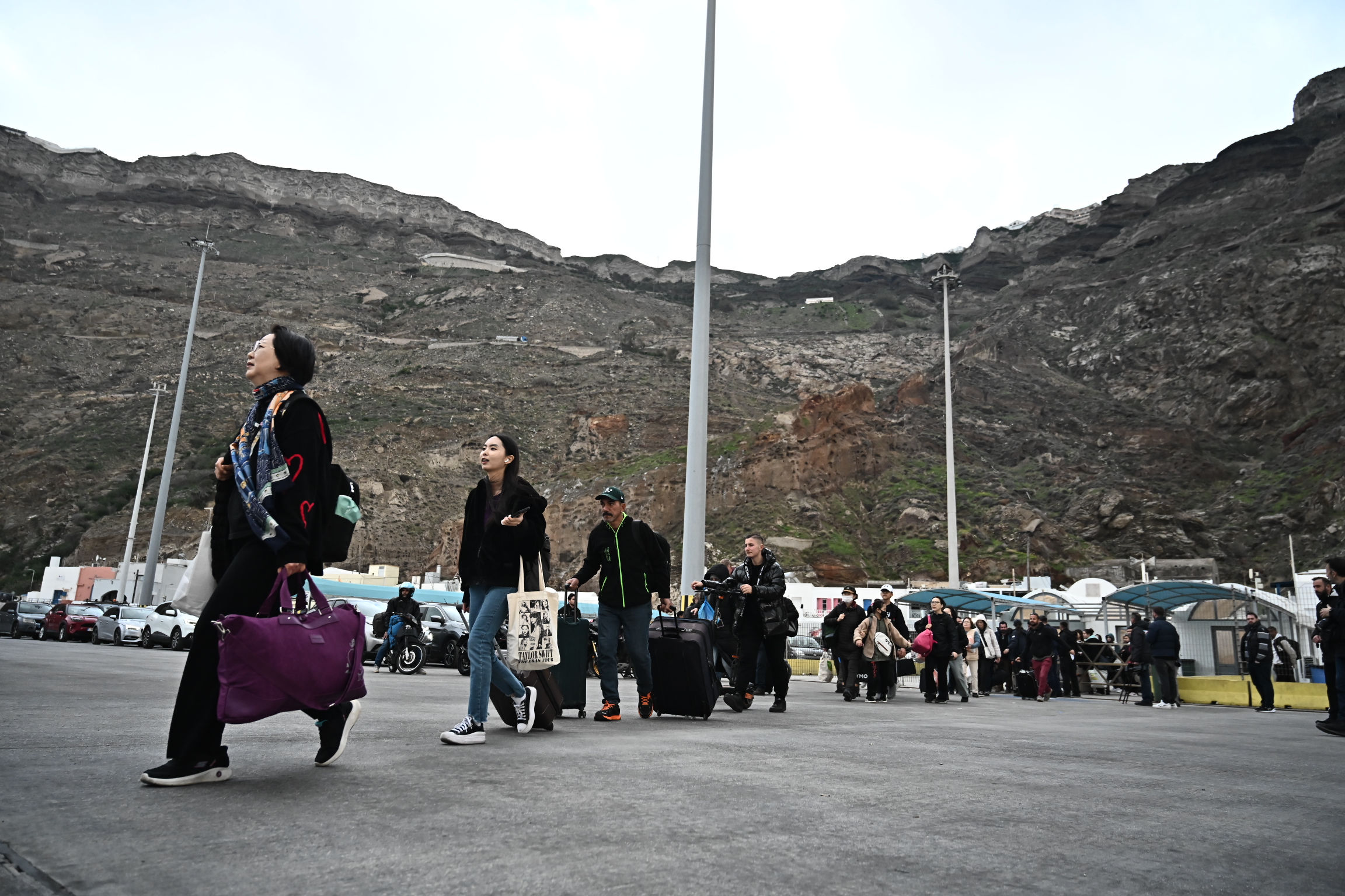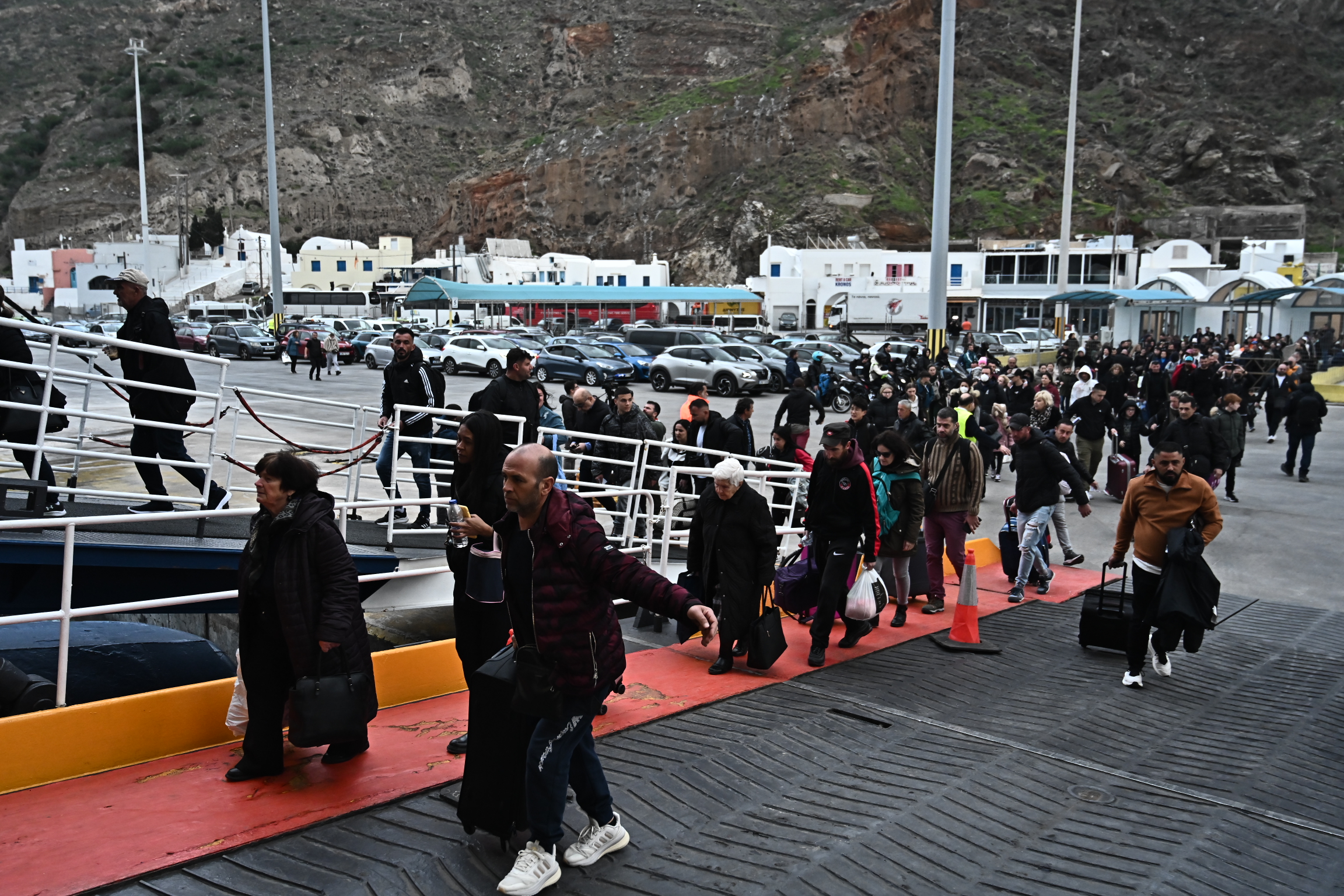 Κάτοικοι και επισκέπτες της Σαντορίνης σχηματίζουν ουρές στο λιμάνι του νησιού στην προσπάθειά τους να το εγκαταλείψουν προσωρινά, υπό τον φόβο νέων ισχυρότερων σεισμών.