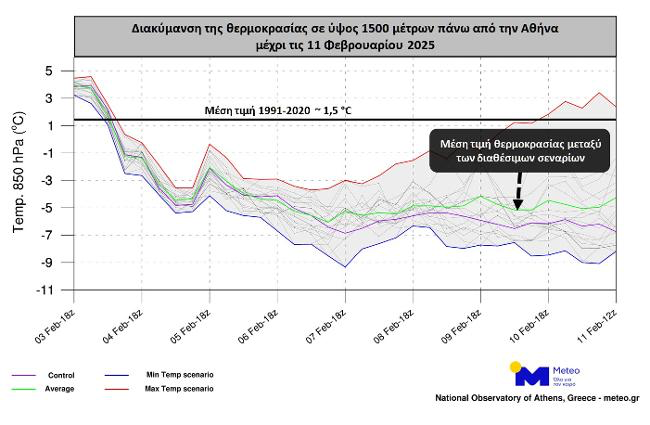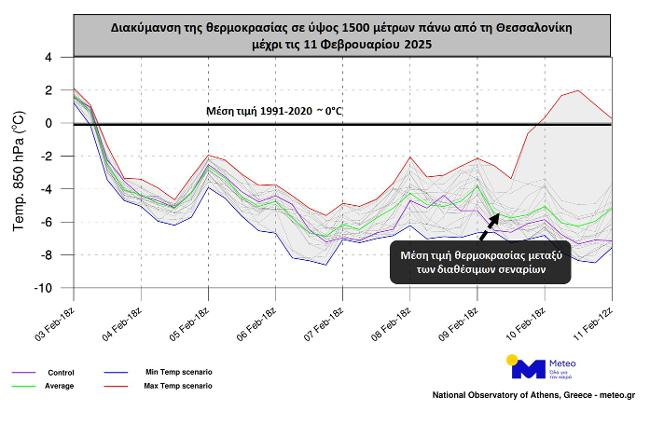 Στην εικόνες που ακολουθούν παρουσιάζεται ενδεικτικά το εύρος διακύμανσης της θερμοκρασίας έως τις 11/02, σε ύψος 1.500 περίπου μέτρων πάνω από την Αθήνα και τη Θεσσαλονίκη. Η Αθήνα επιλέγεται ως ενδεικτική για την ανατολική και νότια χώρα και η Θεσσαλονίκη ως ενδεικτική για την κεντρική και βόρεια χώρα.