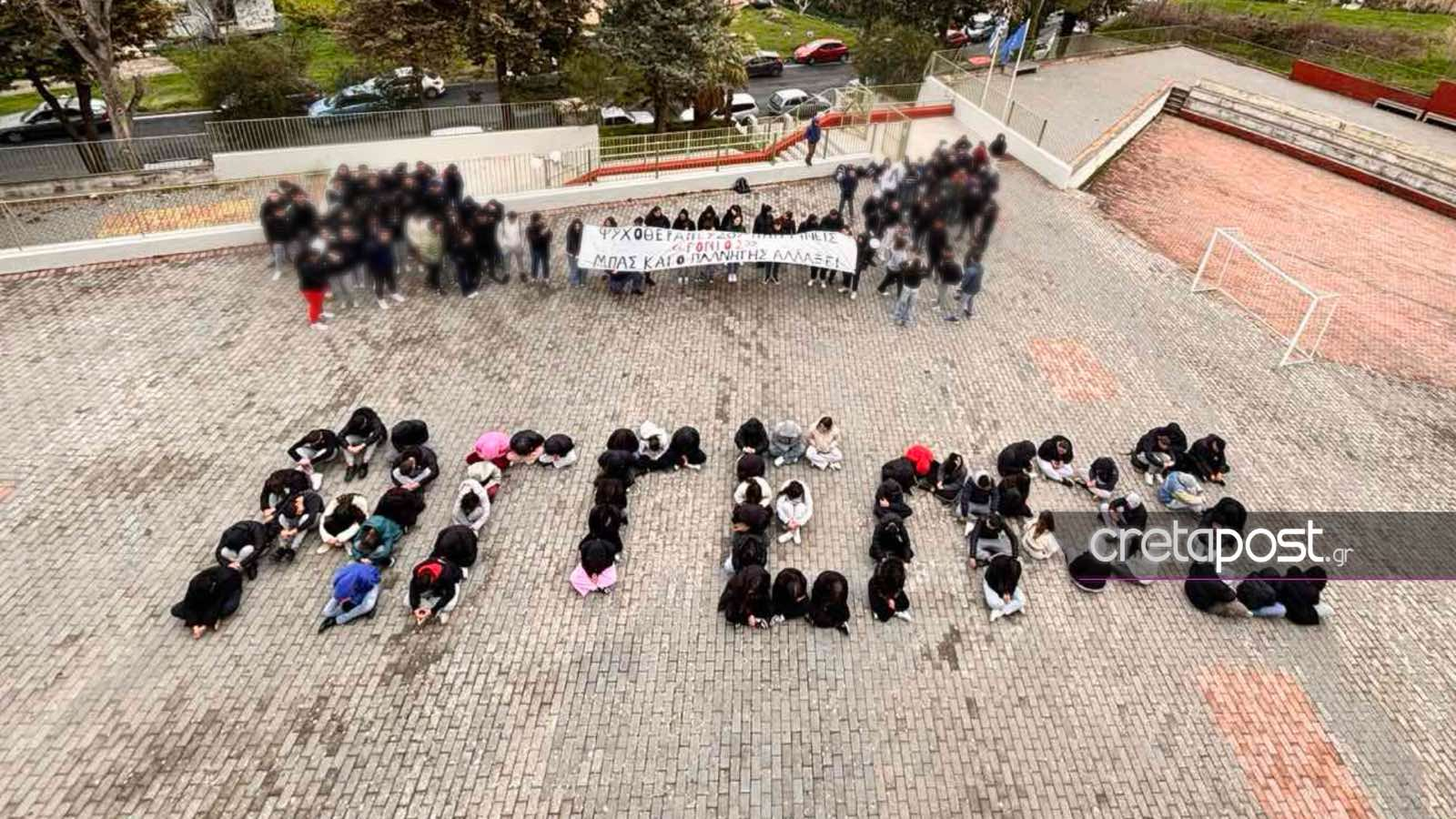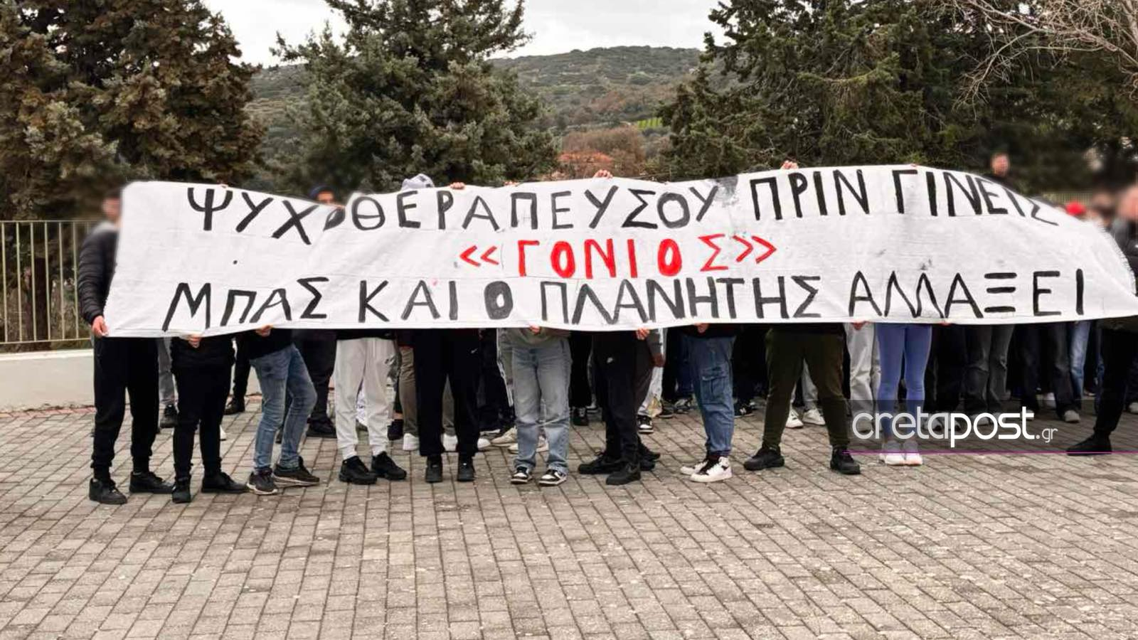 Σύμφωνα με πληροφορίες του cretapost, οι μαθητές ανάρτησαν ένα πανό στο οποίο αναγραφόταν η έκφραση «Ψυχοθεραπεύσου πριν γίνεις “γονιός” μπας και ο πλανήτης αλλάξει».