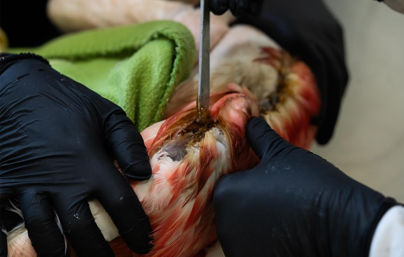 Σύμφωνα με ανακοίνωση της οργάνωσης, μετά από εξέταση του ζώου και ακτινολογικό έλεγχο, διαπιστώθηκε ότι τραυματίστηκε από πυροβόλο όπλο καθώς εντοπίστηκε ένα σκάγι στην περιοχή του στέρνου. Πρόκειται για ένα περιστατικό λαθροθηρίας καθώς το φοινικόπτερο είναι μη θηρεύσιμο είδος και συμπεριλαμβάνεται στον Κόκκινο Κατάλογο των Απειλούμενων Ζώων της Ελλάδας.