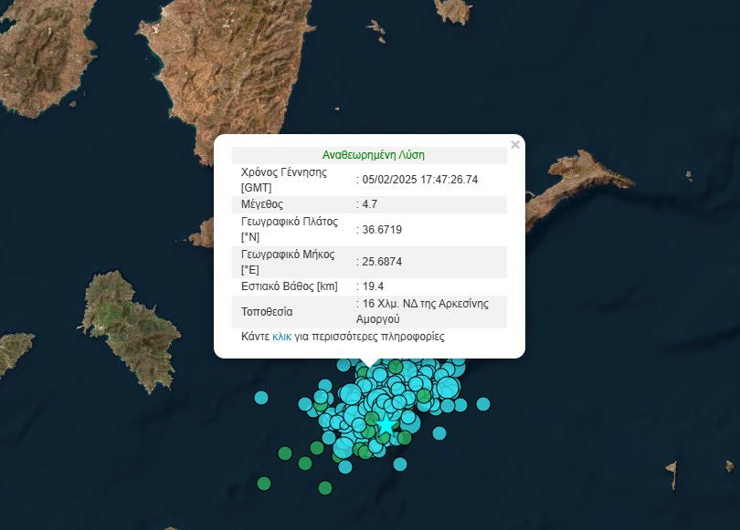Σεισμός 4,7 Ρίχτερ σημειώθηκε στη θαλάσσια περιοχή μεταξύ Σαντορίνης και Αμοργού το απόγευμα της Τετάρτης και έγινε αισθητός στην Αττική.