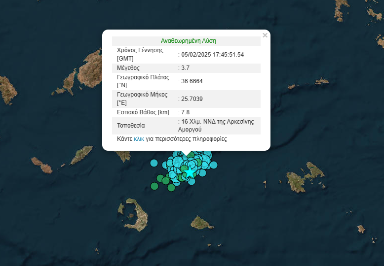 Δύο λεπτά νωρίτερα σημειώθηκε σεισμός 3,7 Ρίχτερ με εστιακό βάθος 7,8 χιλιόμετρα και επίκεντρο 16 νότια νοτιοδυτικά της Αρκεσίνης.