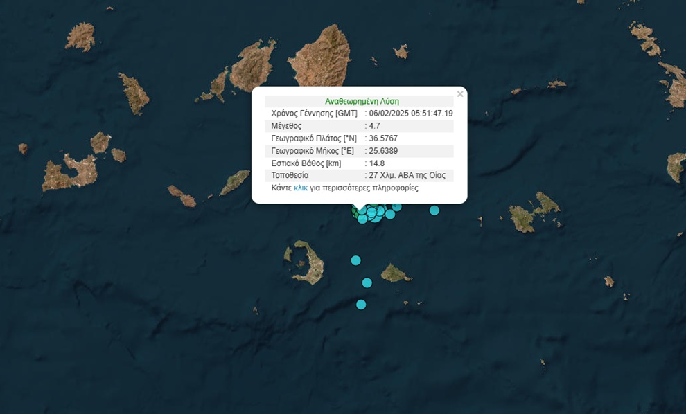 Το πρωί της Πέμπτης (06/02) σημειώθηκε σεισμός 4,7 βαθμών της κλίμακας Ρίχτερ στο 27 χιλιόμετρα βορειοδυτικά της Οίας.