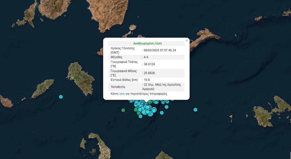 Σεισμός 4,5 βαθμών της κλίμακας Ρίχτερ σημειώθηκε στις 9:57, 22 χιλιόμετρα Νοτιοδυτικά της Αρκεσίνης Αμοργού.