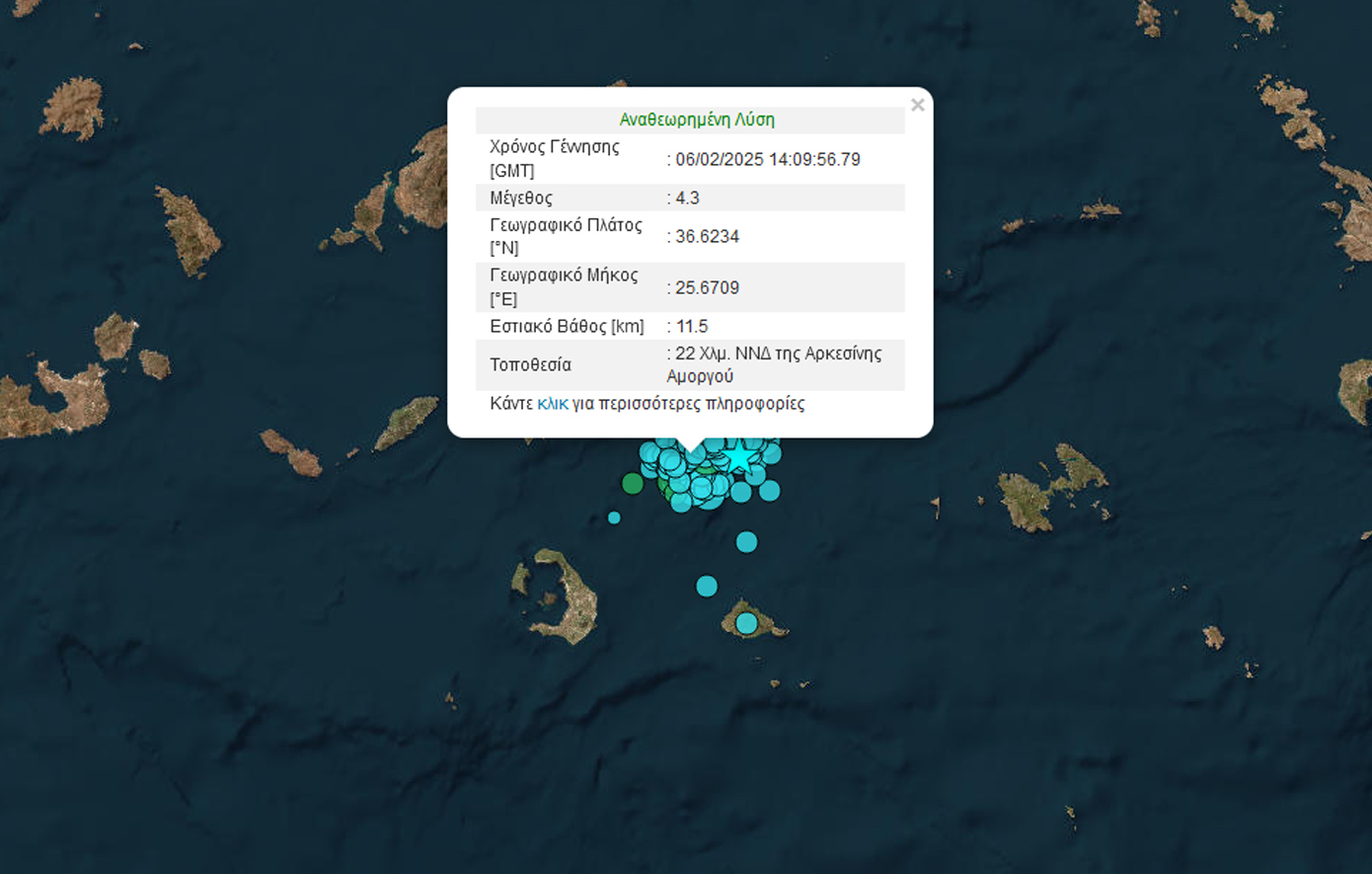 Ειδικότερα, σύμφωνα με το Γεωδυναμικό Ινστιτούτο, το επίκεντρο του σεισμού εντοπίζεται 22 χιλιόμετρα νότια-νοτιοδυτικά της Αρκεσίνης Αμοργού και το εστιακό βάθος είναι στα 11,5 χιλιόμετρα.