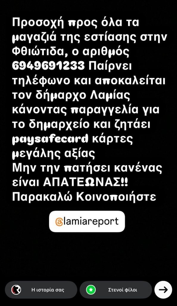 Συγκεκριμένα, απατεώνας τηλεφώνησε σε δύο τουλάχιστον καταστήματα εστίασης προσποιούμενος ότι είναι ο δήμαρχος Λαμιέων Πανουργιάς Παπαϊωάννου και πραγματοποίησε μεγάλη παραγγελία σε σουβλάκια για εκδήλωση κοπή πίτας. Μαζί με τα κρέατα, όμως, ζήτησε και δύο paysafecard των 100 ευρώ, παίρνοντας τηλεφωνικά τον κωδικό.