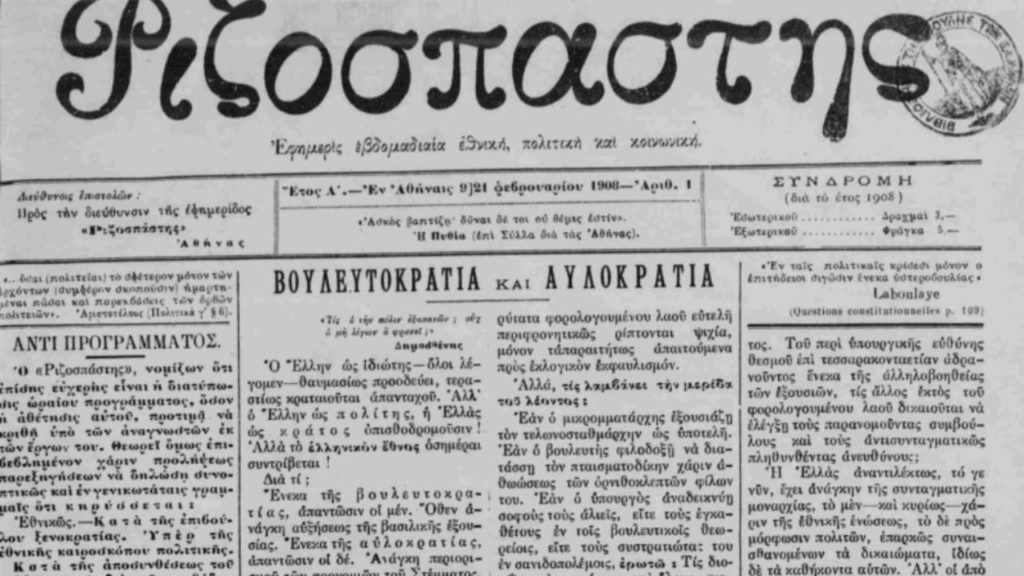 1909: Κυκλοφορεί το πρώτο φύλλο της εφημερίδας «Ριζοσπάστης» με διευθυντή τον Γεώργιο Φιλάρετο, εκφράζοντας ριζοσπαστικές ιδέες κατά της μοναρχίας. Η έκδοσή της σταμάτησε το 1911, αλλά το 1917 επανεκδόθηκε στην Αθήνα από τον Γιάννη Πετσόπουλο, στηρίζοντας το εργατικό κίνημα και το Σοσιαλιστικό Εργατικό Κόμμα Ελλάδας (Σ.Ε.Κ.Ε.), πρόδρομο του ΚΚΕ. Το 1919 χαρακτηρίστηκε «σοσιαλιστική εφημερίς», σηματοδοτώντας τη νέα της πορεία. Κατά τη δικτατορία Μεταξά, την Κατοχή και τη χούντα κυκλοφόρησε παράνομα, μέχρι την επανέκδοσή της στις 25 Σεπτεμβρίου 1974. Στο πρώτο φύλλο μετά τη μεταπολίτευση, ο Χαρίλαος Φλωράκης απηύθυνε χαιρετισμό, ενώ διευθυντής ανέλαβε ο Γρηγόρης Φαράκος. Από τότε, παραμένει το επίσημο όργανο του ΚΚΕ.