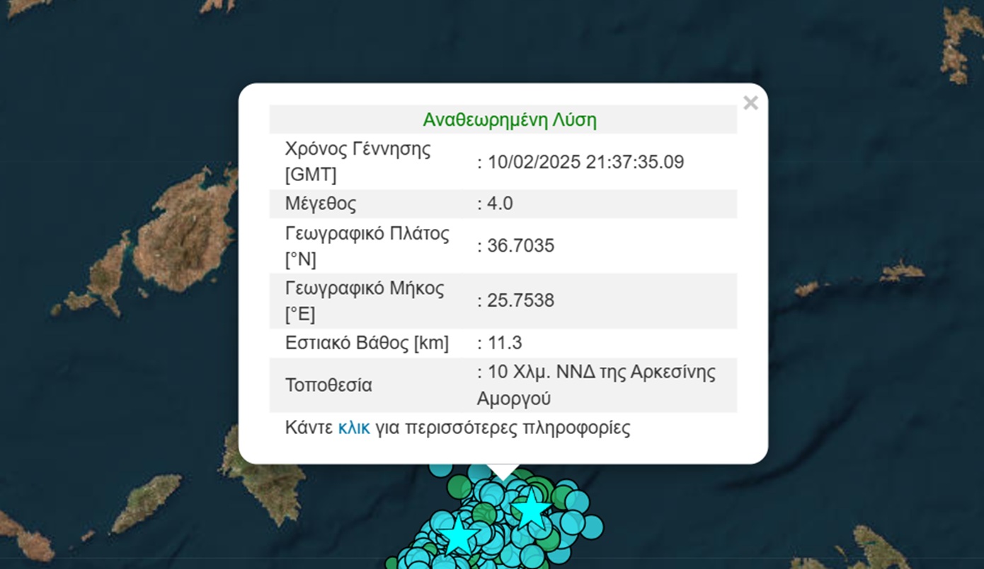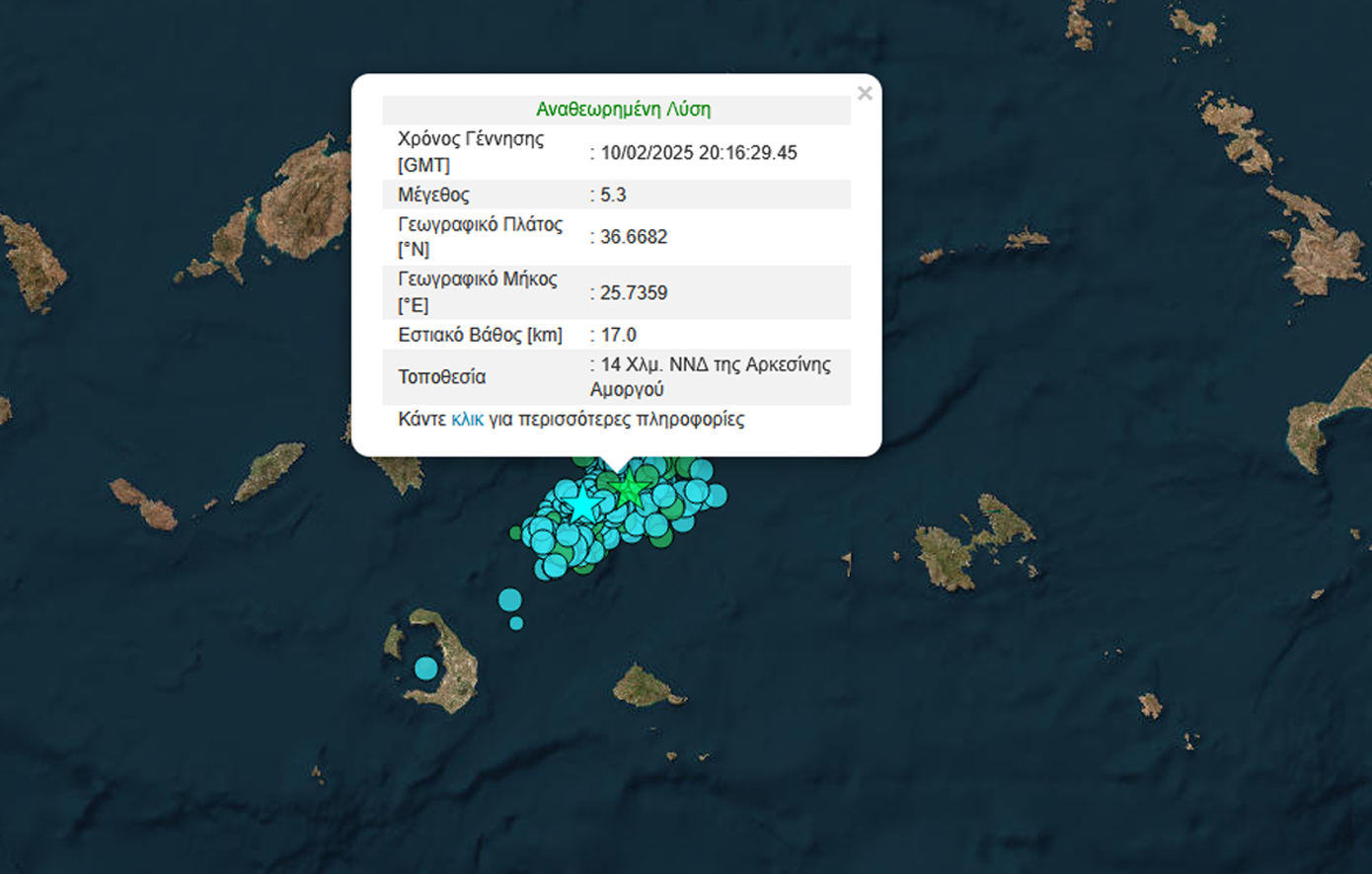 Το επίκεντρο της δόνησης εντοπίζεται στο θαλάσσιο χώρο 10 χιλιόμετρα νότιο – νοτιοδυτικά της Αρκεσίνης Αμοργού.
