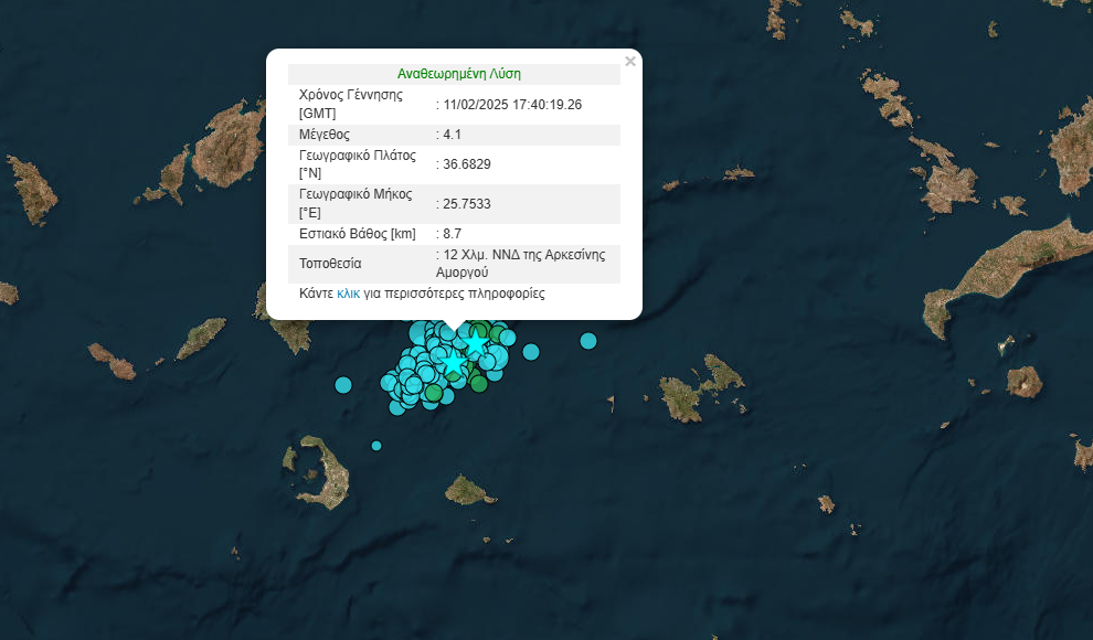 Το επίκεντρο της δόνησης εντοπίζεται στον θαλάσσιο χώρο 12 χιλιόμετρα νότια, νοτιοδυτικά της Αρκεσίνης Αμοργού.