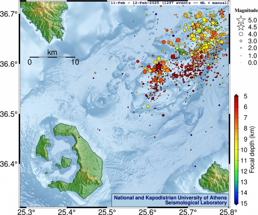 Από την έναρξη της σεισμικής δραστηριότητας στη ζώνη Σαντορίνης-Αμοργού στις 26 Ιανουαρίου έως και τις 11 Φεβρουαρίου 2025, το Εργαστήριο Σεισμολογίας (ΕΣ) του ΕΚΠΑ (http://dggsl.geol.uoa.gr/) έχει ανιχνεύσει και εντοπίσει συνολικά, με αυστηρά κριτήρια για τη διασφάλιση της ποιότητας των αποτελεσμάτων, πάνω από 16,500 σεισμούς με μεθόδους μηχανικής μάθησης (τεχνητής νοημοσύνης), εκ των οποίων άνω των 14,400 με μεγέθη Μ≥1.0.