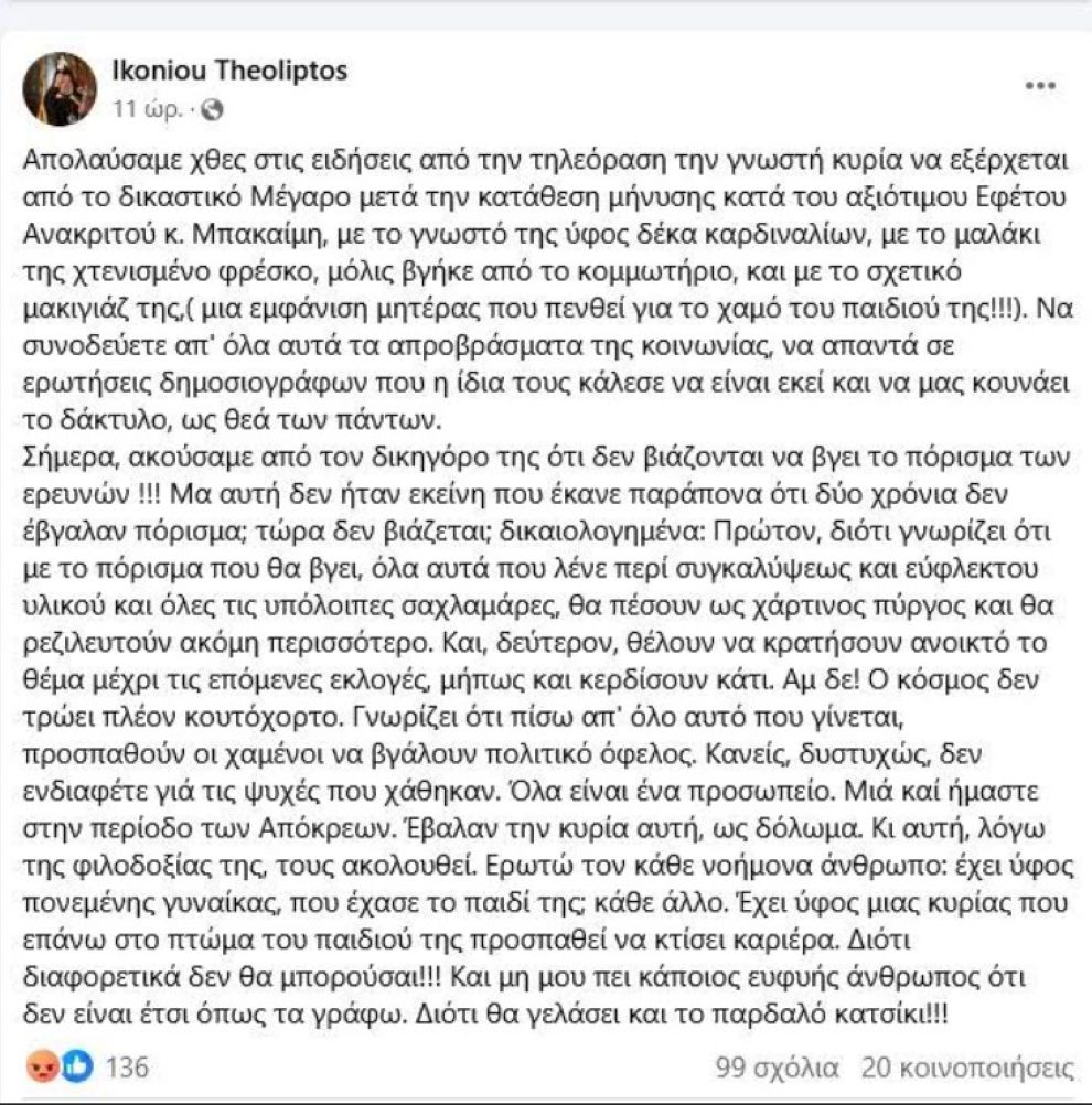 «Απολαύσαμε χθες στις ειδήσεις από την τηλεόραση τη γνωστή κυρία να εξέρχεται από το δικαστικό Μέγαρο μετά την κατάθεση μήνυσης κατά του αξιότιμου Εφέτου Ανακριτού κ. Μπακαίμη, με το γνωστό της ύφος δέκα καρδιναλίων, με το μαλλάκι της χτενισμένο φρέσκο, μόλις βγήκε από το κομμωτήριο, και με το σχετικό μακιγιάζ της (μια εμφάνιση μητέρας που πενθεί για το χαμό του παιδιού της!!!). Να συνοδεύετε απ’ όλα αυτά τα αποβράσματα της κοινωνίας, να απαντά σε ερωτήσεις δημοσιογράφων που η ίδια τους κάλεσε να είναι εκεί και να μας κουνάει το δάκτυλο, ως θεά των πάντων.