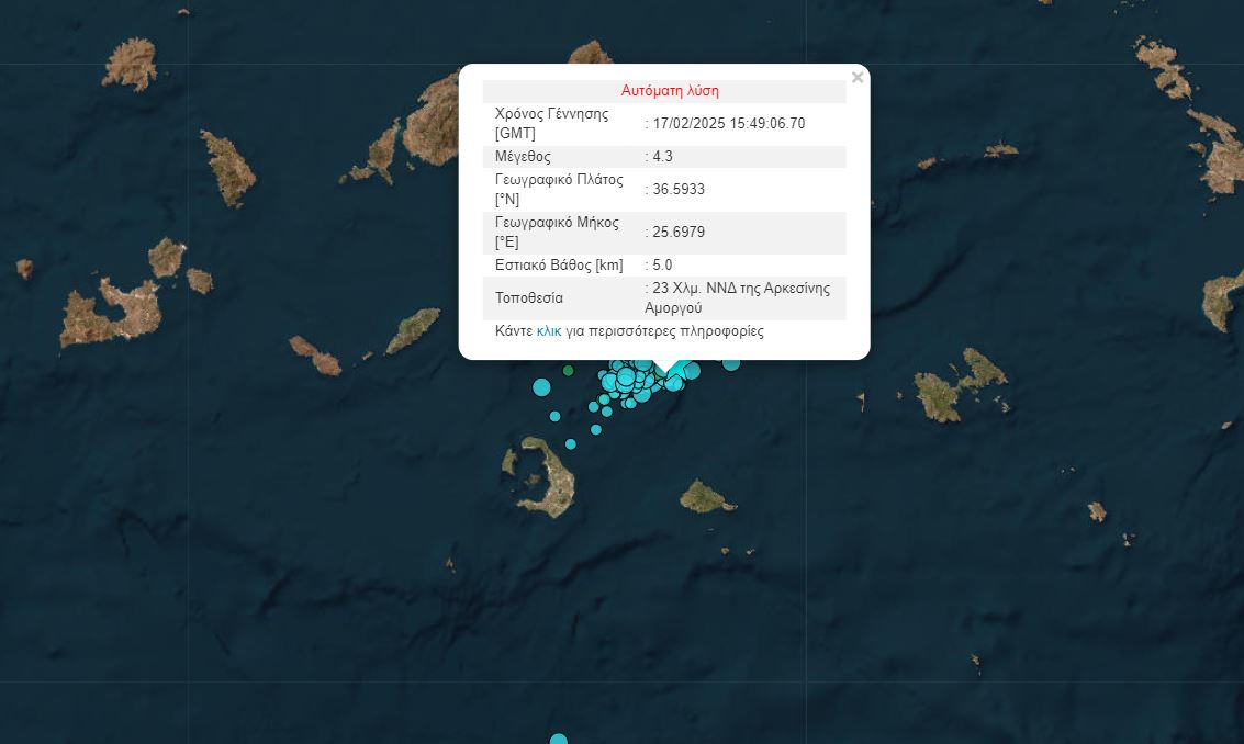 Σεισμική δόνηση 4,3 βαθμών της κλίμακας Ρίχτερ σημειώθηκε στις 17:49 το απόγευμα της Δευτέρας στον θαλάσσιο χώρο μεταξύ Αμοργού και Σαντορίνης.