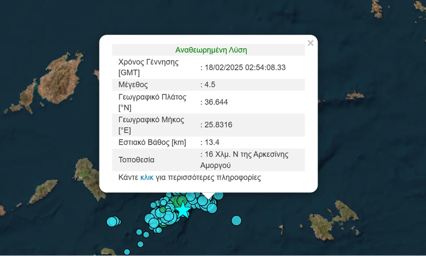 Ο σεισμός είχε επίκεντρο στα 16 χλμ νοτιοδυτικά της Αρκεσίνης Αμοργού κι εστιακό βάθος τα 13,4 χλμ.