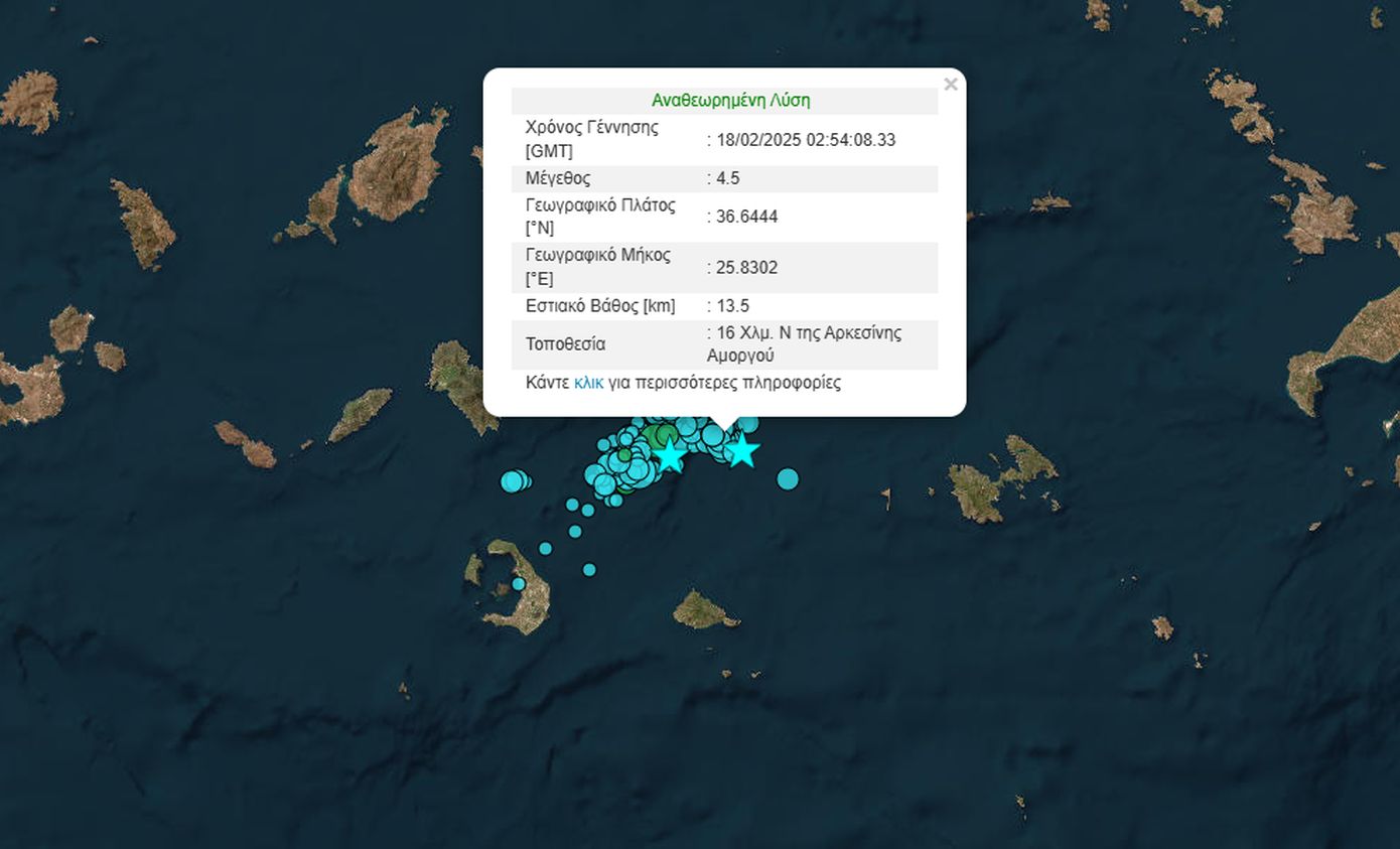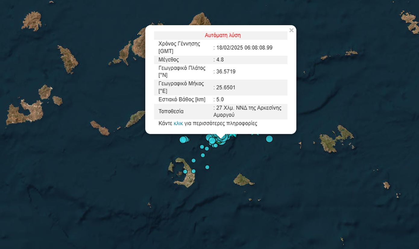 Το επίκεντρο εντοπίζεται στα 17 Χλμ. ΝΝΑ της Αρκεσίνης Αμοργού.