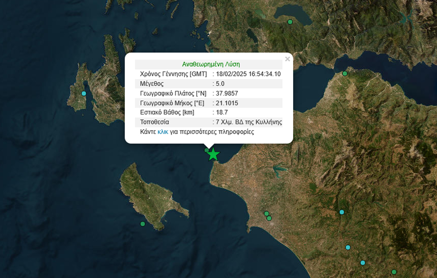 Ισχυρός σεισμός 5 βαθμών της κλίμακας Ρίχτερ σημειώθηκε στις 18:54 της Τρίτης (18/02) στο θαλάσσιο χώρο 7 χιλιόμετρα βορειοδυτικά της Κυλλήνης.