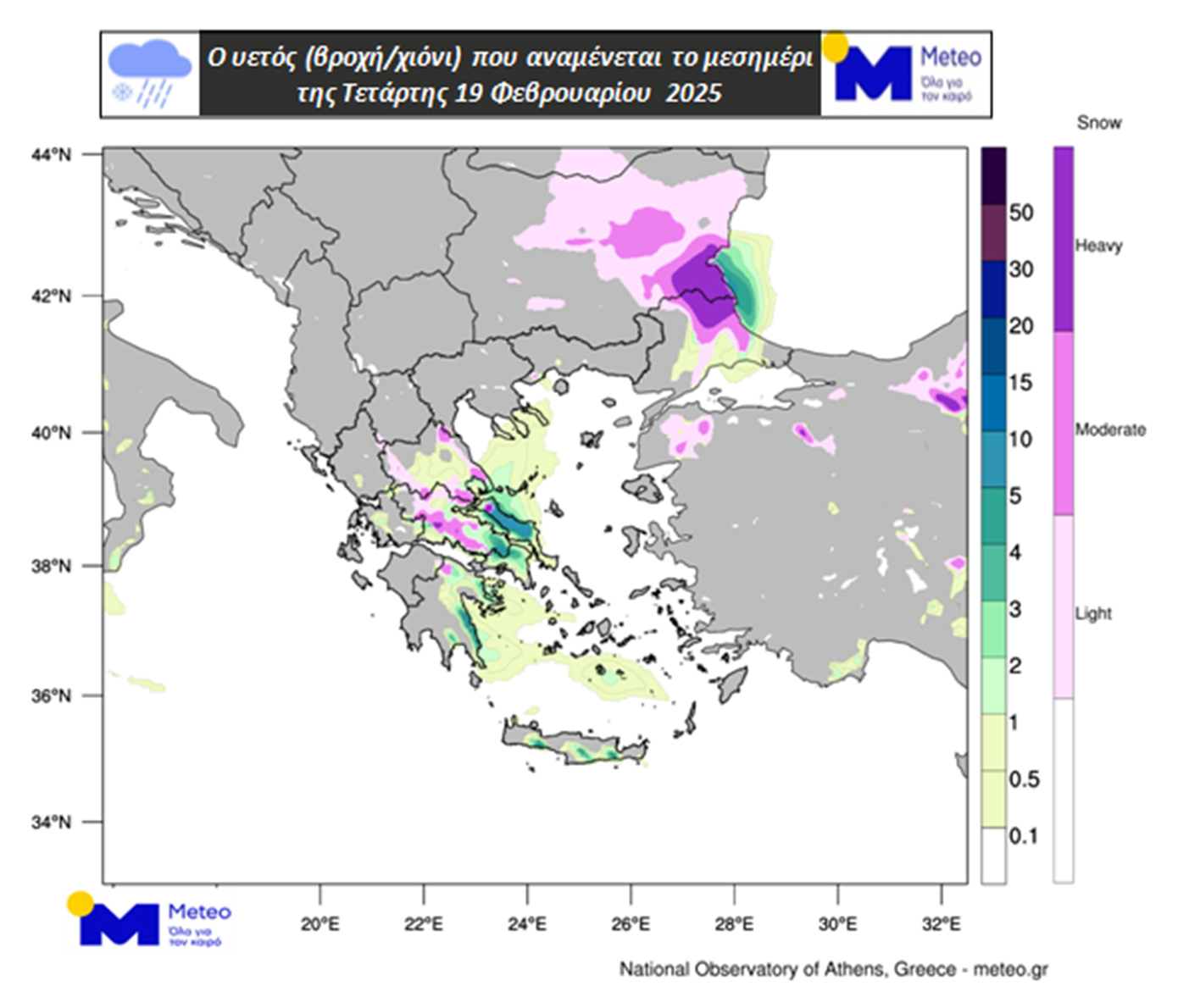 Στην κεντρική και ανατολική Στερεά, την Εύβοια και την ανατολική Πελοπόννησο από τους 01 έως τους 10 με 12 και κατά τόπους στην ανατολική Πελοπόννησο τους 13 βαθμούς Κελσίου. Στα δυτικά και στην υπόλοιπη νησιωτική χώρα θα κυμανθεί από τους 08 έως τους 16 βαθμούς Κελσίου.