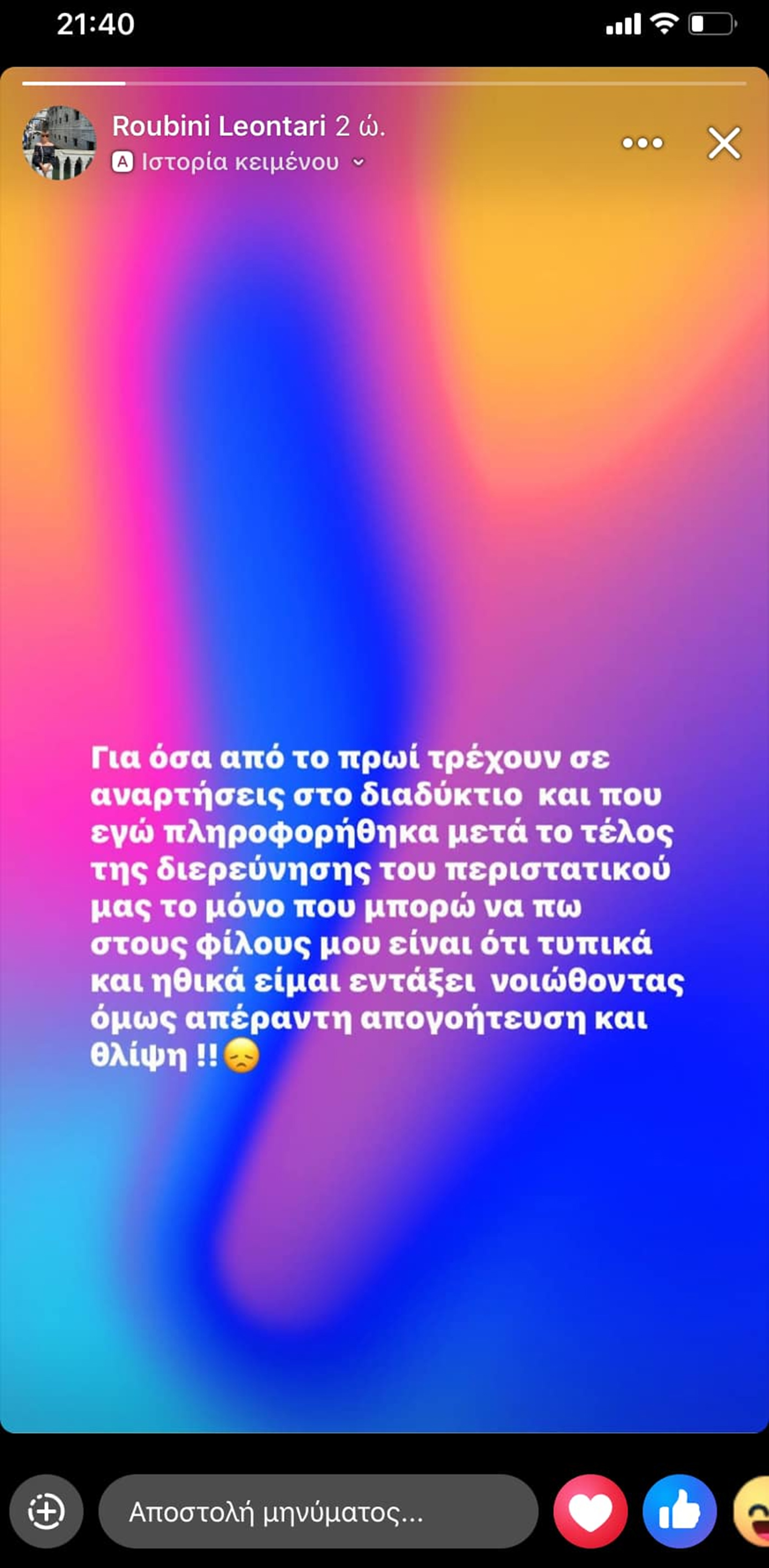 «Για όσα από το πρωί τρέχουν σε αναρτήσεις στο διαδύκτιο και που εγώ πληροφορήθηκα μετά το τέλος της διερεύνησης του περιστατικού μας το μόνο που μπορώ να πω στους φίλους μου είναι ότι τυπικά και ηθικά είμαι εντάξει νιώθοντας όμως απέραντη απογοήτευση και θλίψη!!», έγραψε συγκεκριμένα, σύμφωνα με το onlarissa.gr.
