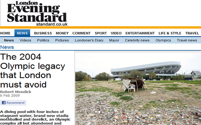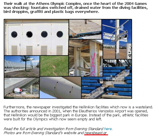 Με αφορμή την έρευνα του newsbeast.gr για την τραγική κατάσταση που βρίσκεται το ΟΑΚΑ και τα Ολυμπιακά έργα μετά το τέλος των Αγώνων, οι Βρετανοί χρησιμοποιούν το παράδειγμα της Αθήνας για να αποφύγουν μελλοντικά λάθη στους δικούς του Αγώνες στο Λονδίνο το 2012. Χρησιμοποιώντας φωτογραφικό υλικό αλλά και στοιχεία της έρευνας του newsbeast.gr καυτηριάζουν τα κακώς κείμενα επί ελληνικού εδάφους και στέλνουν το μήνυμα στους υπεύθυνους της δικής τους διοργάνωσης.