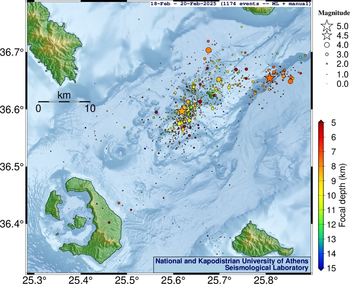 Από την έναρξη της σεισμικής δραστηριότητας στη ζώνη Σαντορίνης-Αμοργού στις 26 Ιανουαρίου έως και τις 19 Φεβρουαρίου 2025, το Εργαστήριο Σεισμολογίας (ΕΣ) του ΕΚΠΑ (http://dggsl.geol.uoa.gr/) έχει ανιχνεύσει και εντοπίσει συνολικά, με αυστηρά κριτήρια για τη διασφάλιση της ποιότητας των αποτελεσμάτων, πάνω από 22,600 σεισμούς με μεθόδους μηχανικής μάθησης (τεχνητής νοημοσύνης), εκ των οποίων άνω των 19,300 με μεγέθη Μ³1.0. Στις 18 Φεβρουαρίου καταγράφηκαν πάνω από 600 σεισμοί, με 37 να έχουν μέγεθος Μ³2.5, τρεις (3) σεισμούς με Μ³4.0, και δύο (2) με Μ³4.5, με τους δύο ισχυρότερους σεισμούς, μεγέθους 4.9, να σημειώνονται στις 06:46:53 και 08:08:09 (τοπική ώρα). Στις 19 Φεβρουαρίου καταγράφηκαν πάνω από 450 σεισμοί, με 27 να έχουν μέγεθος Μ³2.5, έναν (1) σεισμό με Μ³4.0, και κανέναν (0) με Μ³4.5, με τον ισχυρότερο σεισμό μεγέθους 4.2 να καταγράφεται στις 11:41:09 (τοπική ώρα) βόρεια της Ανύδρου. Σύμφωνα με τα στοιχεία καθημερινής ανάλυσης σεισμικών δεδομένων (χωρίς χρήση μεθόδων μηχανικής μάθησης) του Εργαστηρίου Σεισμολογίας του ΕΚΠΑ, κατά την 20η Φεβρουαρίου έχουν καταγραφεί 57 σεισμοί, εκ των οποίων κανένας (0) με μέγεθος M³4.0. O ισχυρότερος σεισμός, μεγέθους 3.7, σημειώθηκε στις 00:09:53 της 21ης Φεβρουαρίου (τοπική ώρα). Η σεισμικότητα παρουσιάζει σταδιακή ύφεση, τόσο ως προς τον ημερήσιο αριθμό σεισμών όσο και ως προς το μέγιστο μέγεθος, χωρίς να έχει παρατηρηθεί κάποια νέα μικροσεισμική έξαρση από τις 15 Φεβρουαρίου.