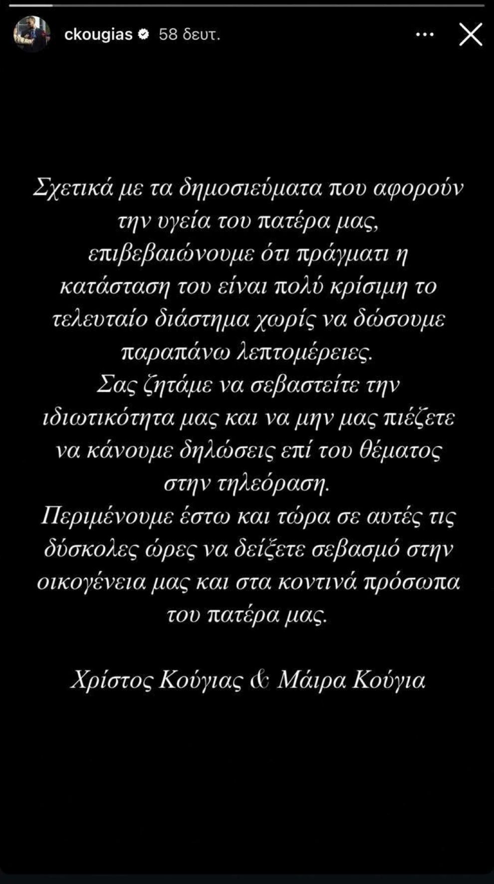 Μάλιστα, τα παιδιά του σε ανάρτησή τους αναφέρουν πως η κατάσταση της υγείας του είναι πολύ κρίσιμη και ζητούν διακριτικότητα. Συγκεκριμένα, γράφουν: