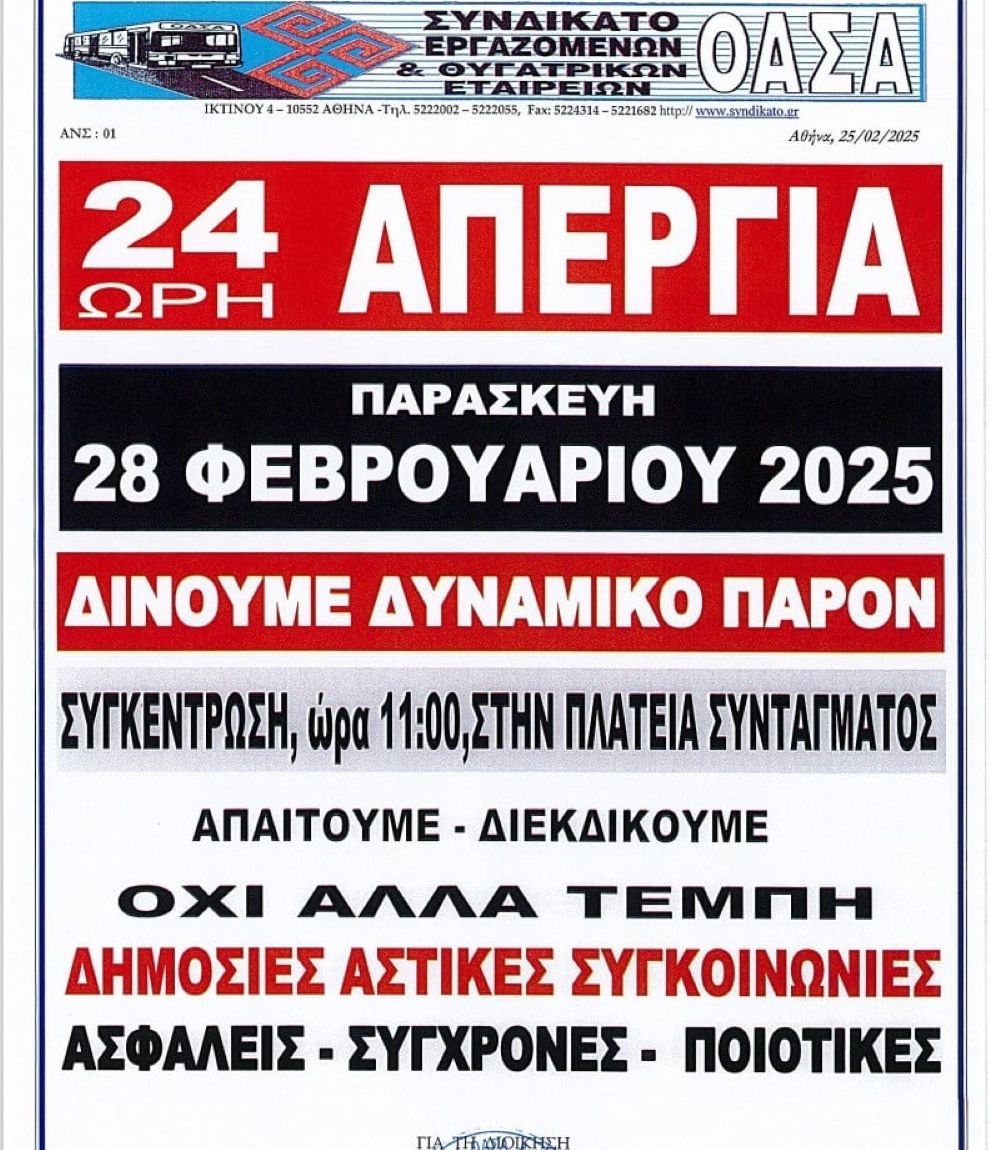 24ωρη απεργία στα λεωφορεία την Παρασκευή 28 Φεβρουαρίου αποφάσισε να πραγματοποιήσει το Συνδικάτο Εργαζομένων ΟΑΣΑ, ενόψει και του συλλαλητηρίου για τα Τέμπη.