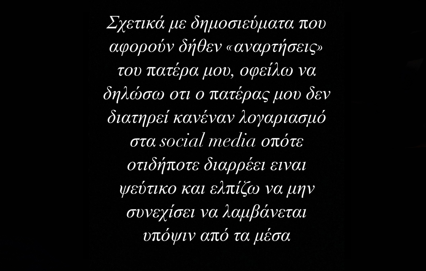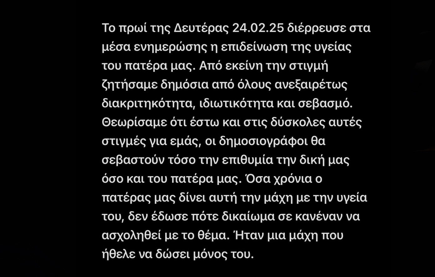 «Το πρωί της Δευτέρας 24.02.25 διέρρευσε στα μέσα ενημέρωσης η επιδείνωση της υγείας του πατέρα μας. Από εκείνη τη στιγμή ζητήσαμε δημόσια -απ’ όλους ανεξαιρέτως- διακριτικότητα, ιδιωτικότητα και σεβασμό. Θεωρήσαμε ότι έστω και στις δύσκολες αυτές στιγμές για εμάς, οι δημοσιογράφοι θα σεβαστούν, τόσο την επιθυμία τη δική μας, όσο και του πατέρα μας. Όσα χρόνια ο πατέρας μας δίνει αυτή τη μάχη με την υγεία του, δεν έδωσε ποτέ δικαίωμα σε κανέναν να ασχοληθεί με το θέμα. Ήταν μια μάχη που ήθελε να δώσει μόνος του.